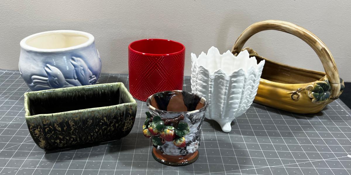 Random Lot Of Planters: Dolphins, Red, Tan Basket with Ivy