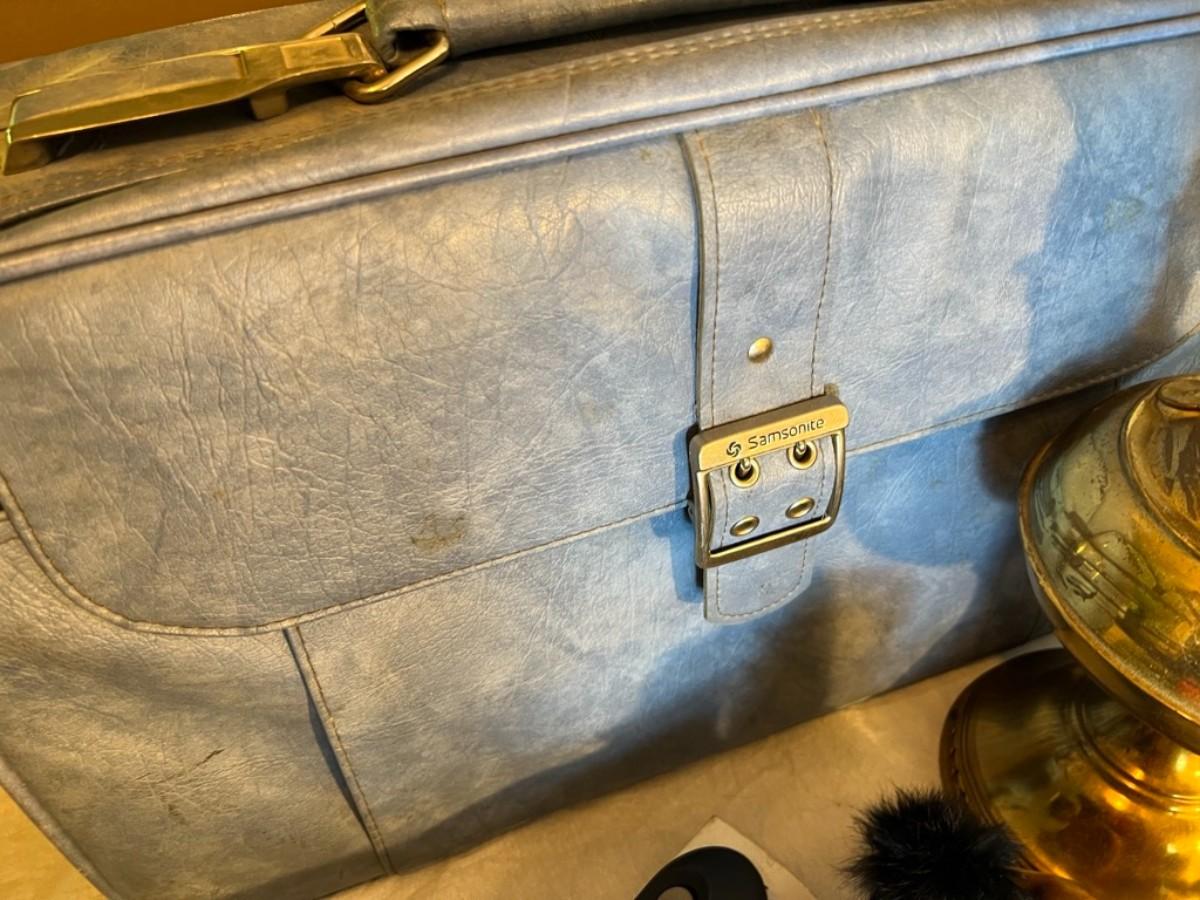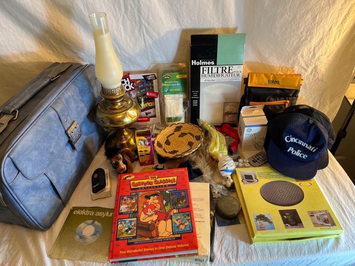 Random Miscellaneous Lot Vintage Hats, Book, Lamp, Suitcase, Garage Door Opener