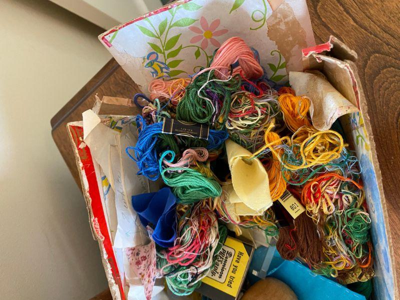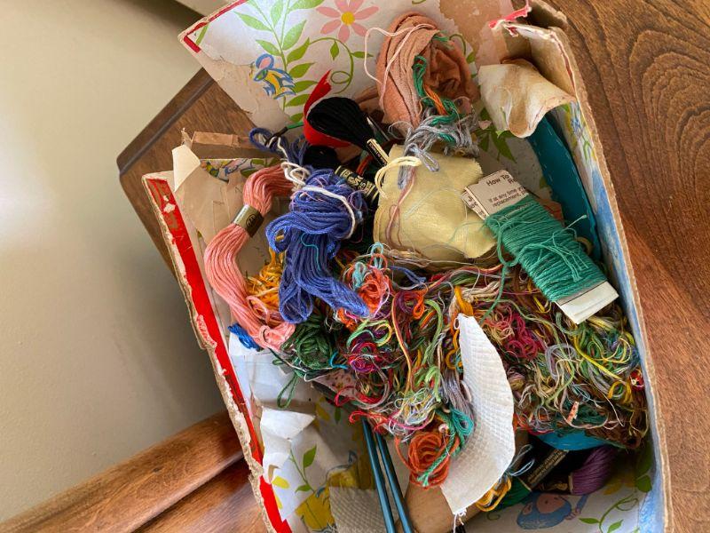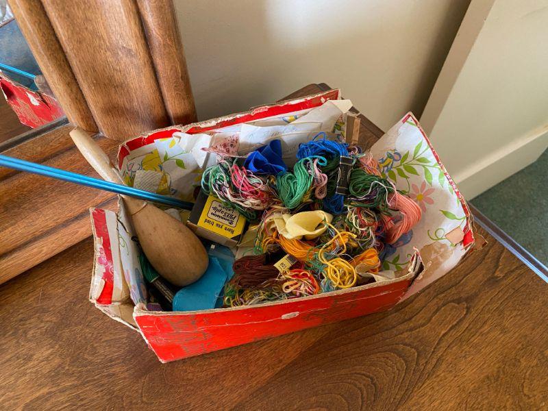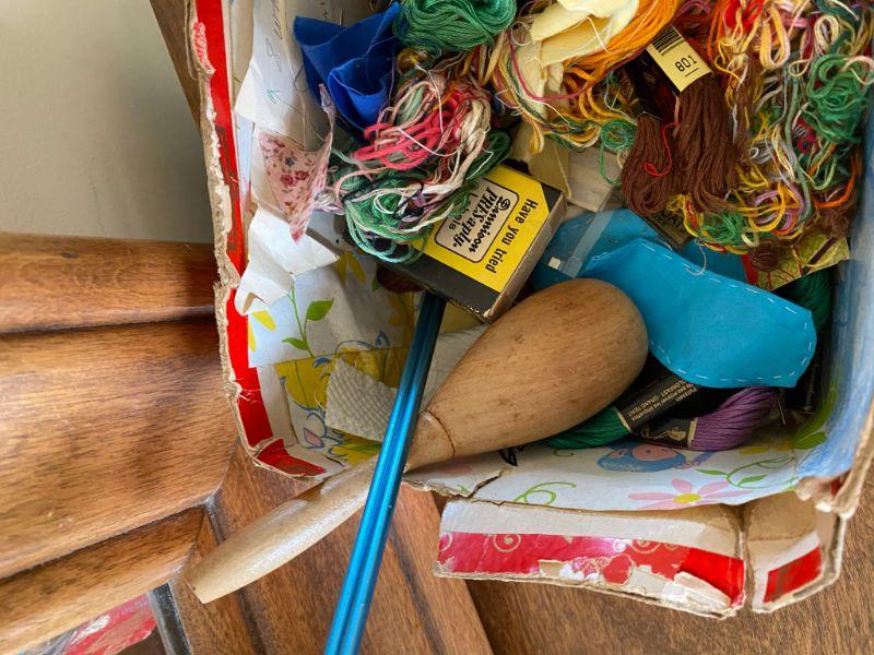 Small random sewing lot. Embroidery thread, a pair of knitting needles, a sock darner, buttons, etc.