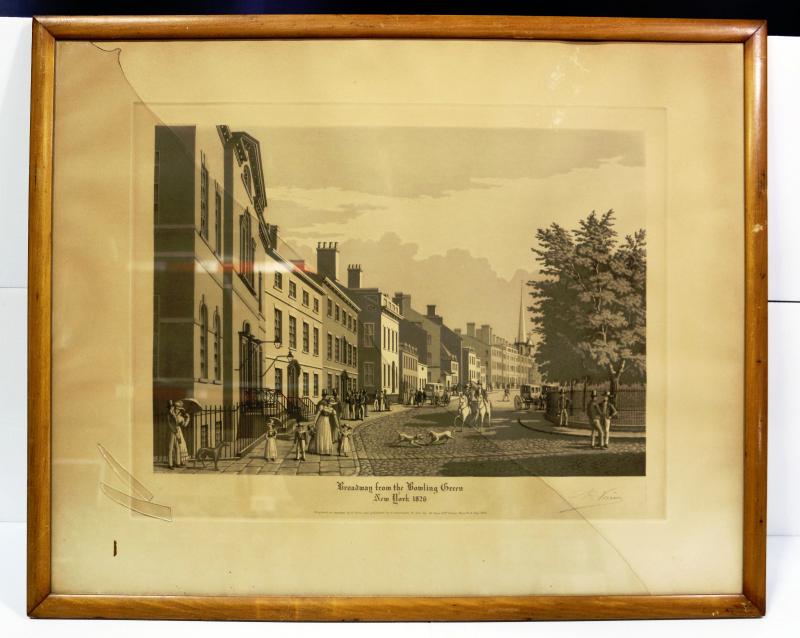 Set of 2 antique engravings by Raoul Varin (French, 1865-1943), signed in pencil, published in 1931, featuring Manhattan of New York City, framed with glass front - one artwork has glass front broken/cracked, the other one is intact.
