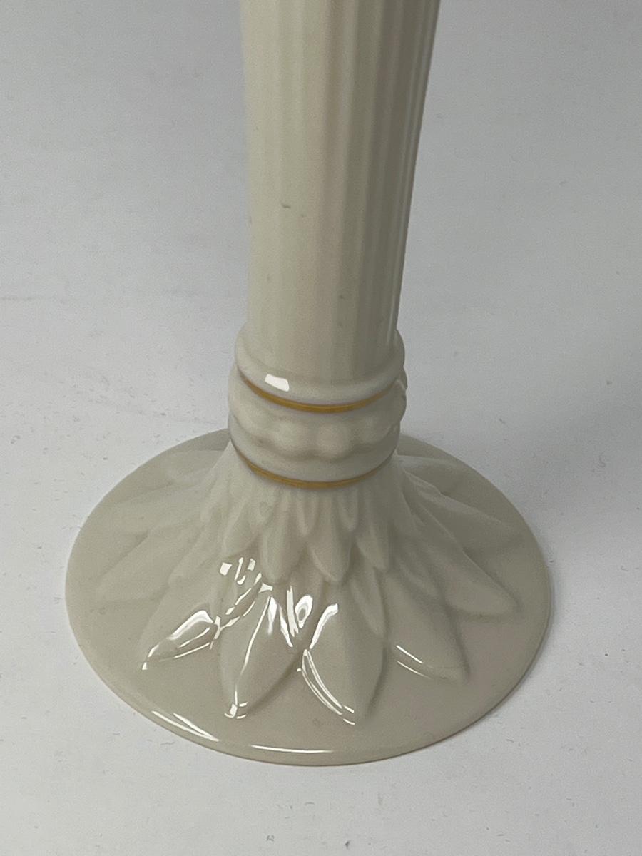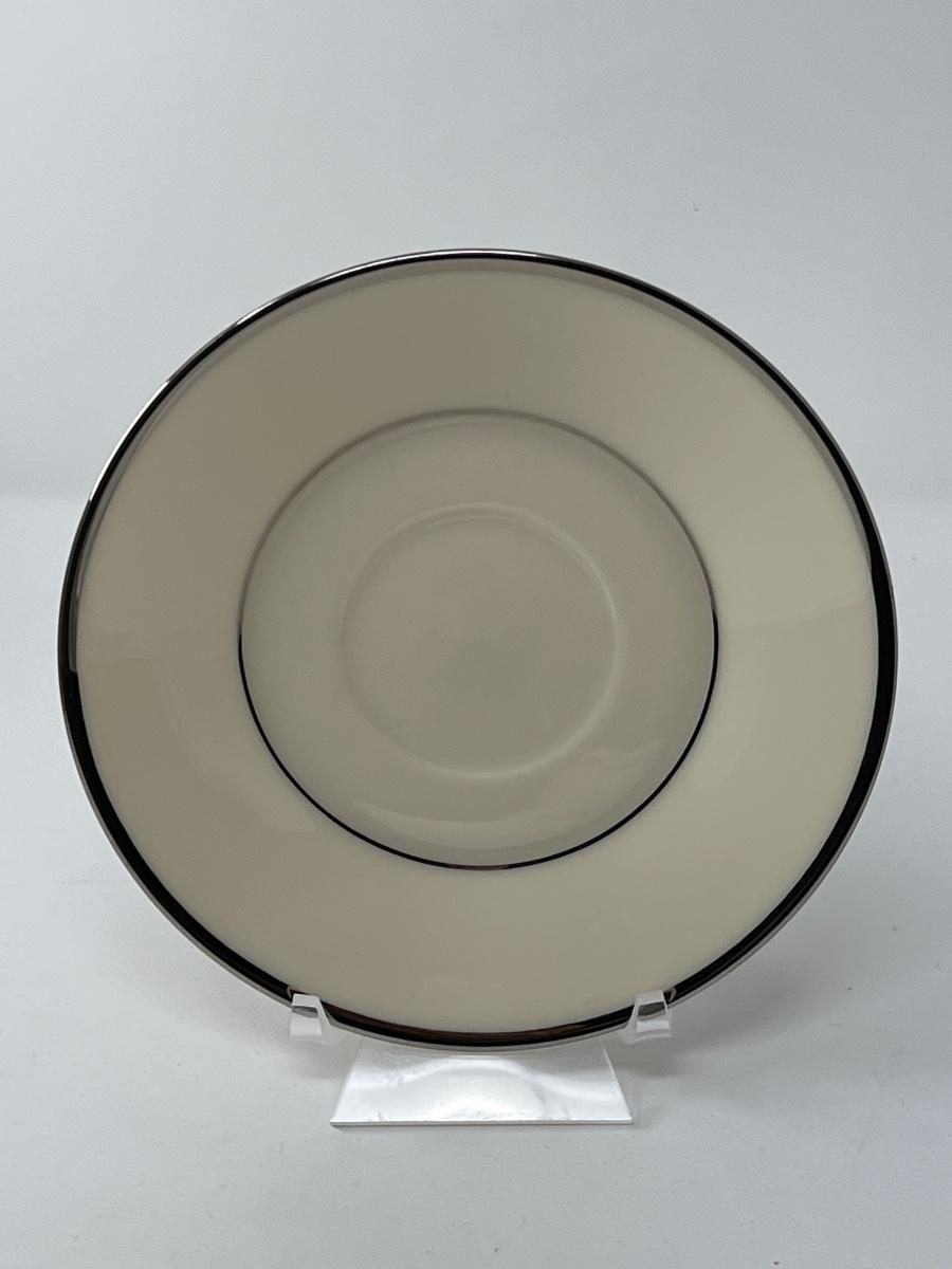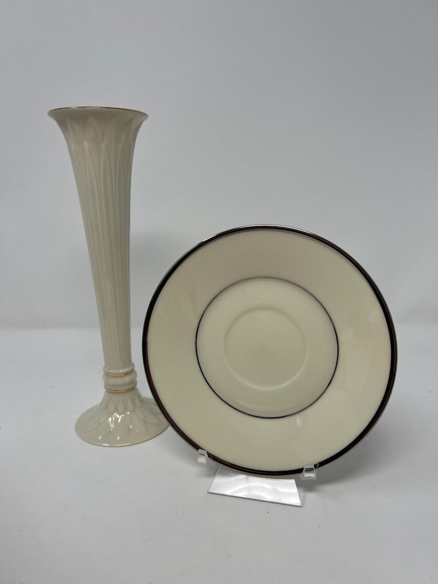 Fine porcelain: Saucer Made in U.S.A., Rapture Style, Lenox, silver trim, cream toned 6” diameter and Gold trimmed cream 9” tall bud vase , Lenox, made in U.S.A.