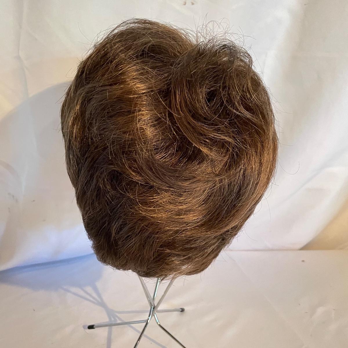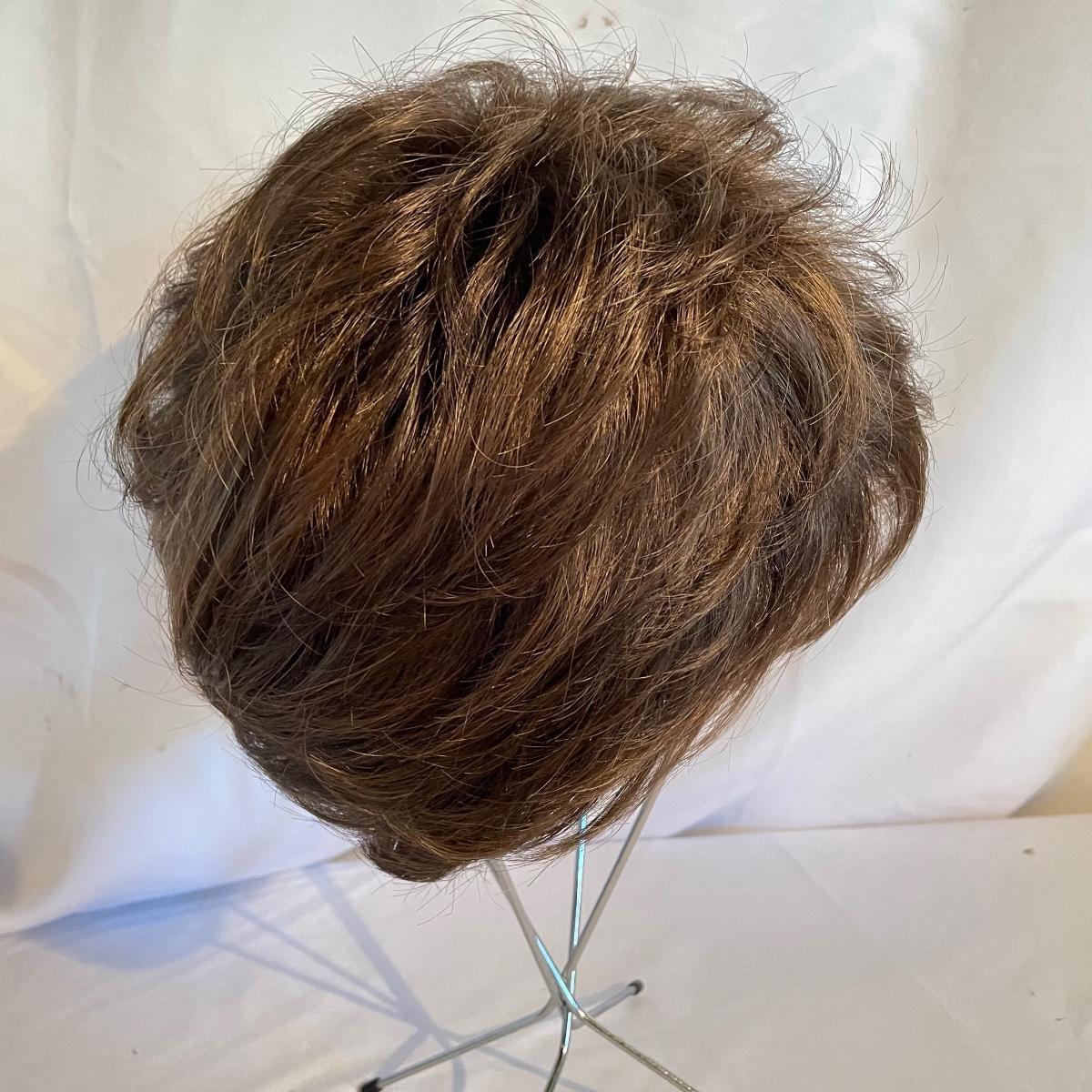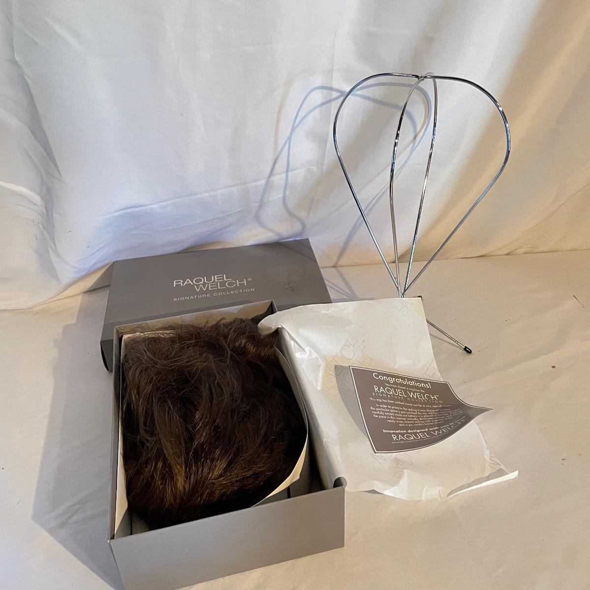 Deep chocolate brown wig by the Raquel Welch Signature Collection with metal wig stand. This is a short hair style, hairs seem to vary between 3” and 4”. The very last image shows the truest color, although the fibers catch light extremely well. Shipping available.