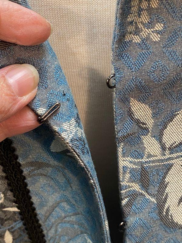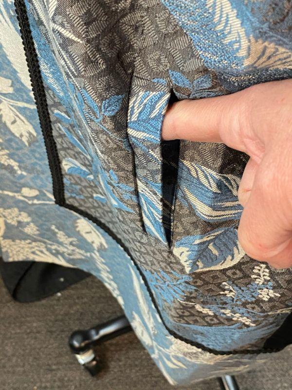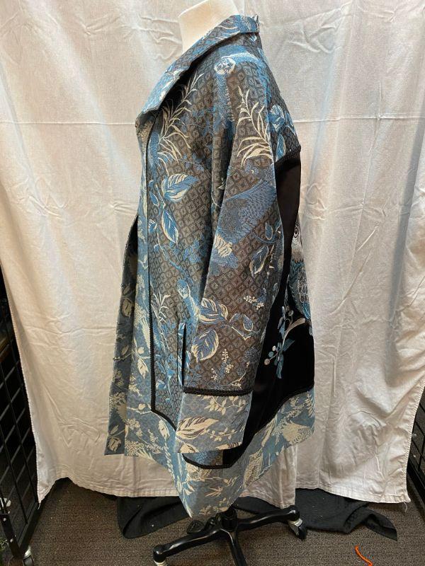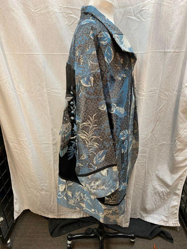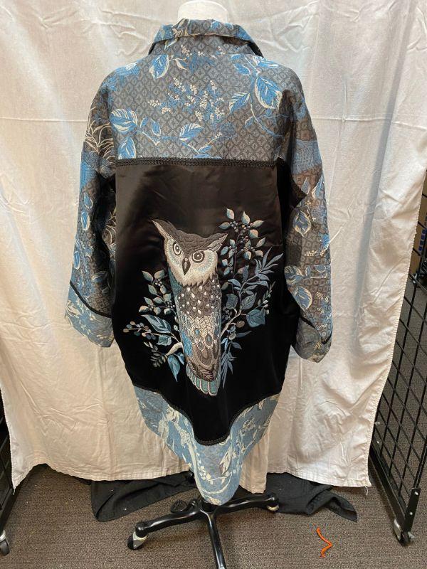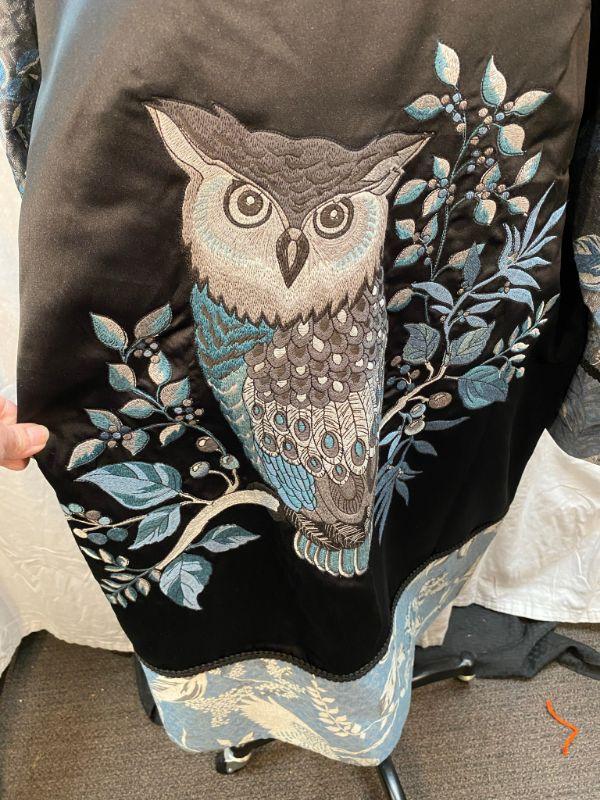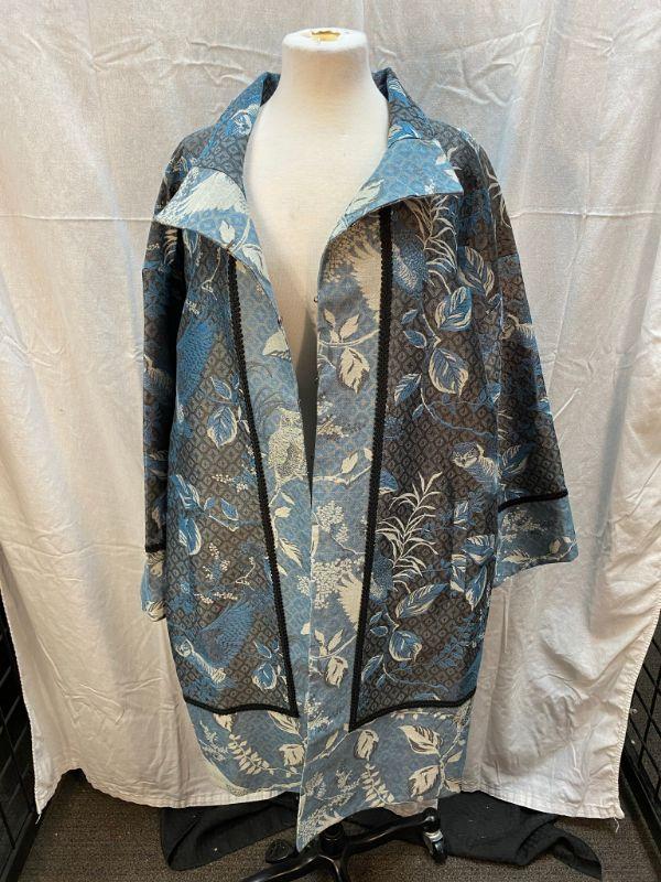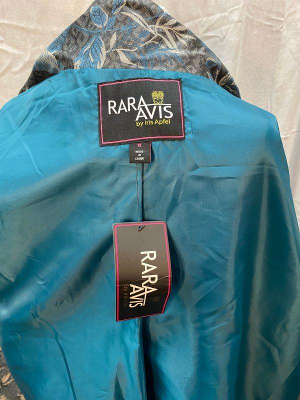 Rara Avis by Iris Apfel owl coat. Done in a silver blue jacquard woven tapestry like material. Hook and eye closure. The back is black with a large embroidered owl on it. Bright blue lining. There is still the original hang tag attached. Size 1X. Good condition. Knee length.