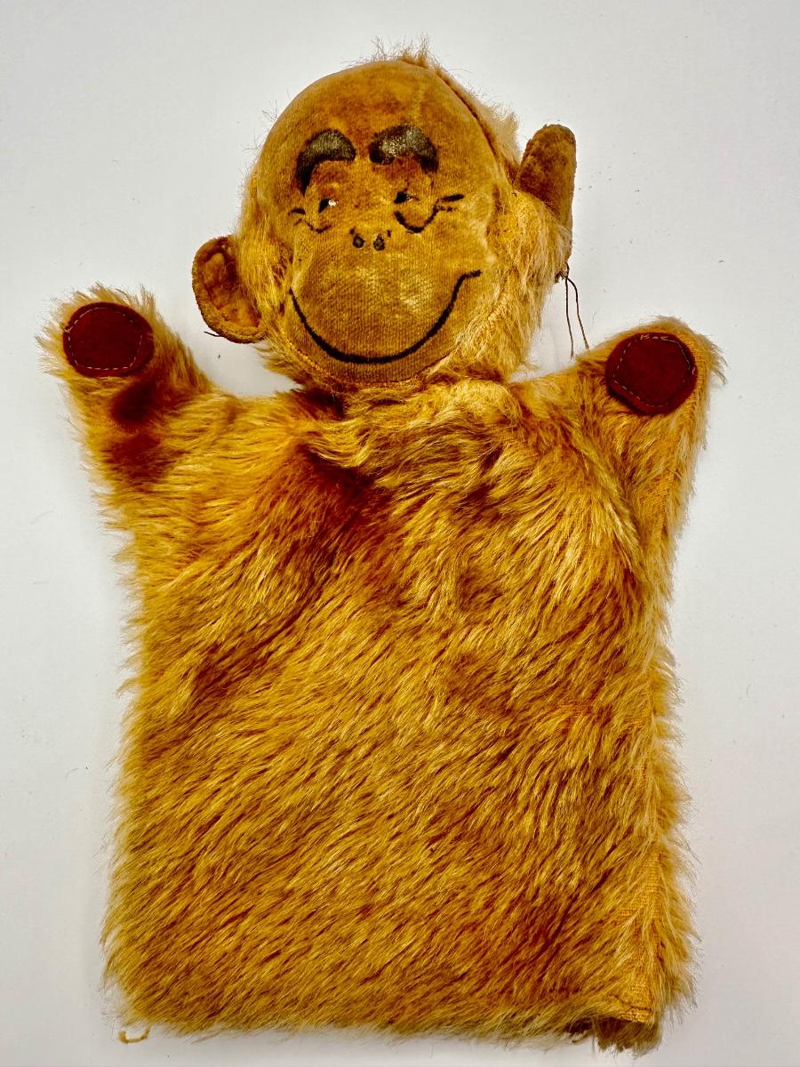 An amazing find! Merrythought “Gran’pop” monkey puppet from the “˜30’s-“˜40’s. This rare hand puppet is made from dark golden beige mohair, with velvet ears and face which is hand painted, little felt hand pads. The Merrythought label is securely attached to the back bottom. He is in good but well loved condition, rubbing and wear to the velvet face, some bald patches to the mohair, left ear stitching is coming loose (see pictures). 9 ½” tall. This is a vintage item and sold as memorabilia for collectors. It might not conform to regulatory standards of today, so is not suitable for children and is not sold as a toy.
