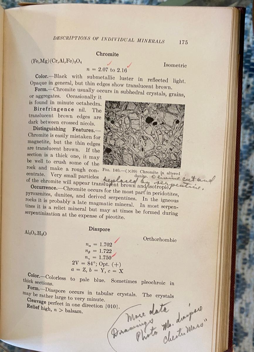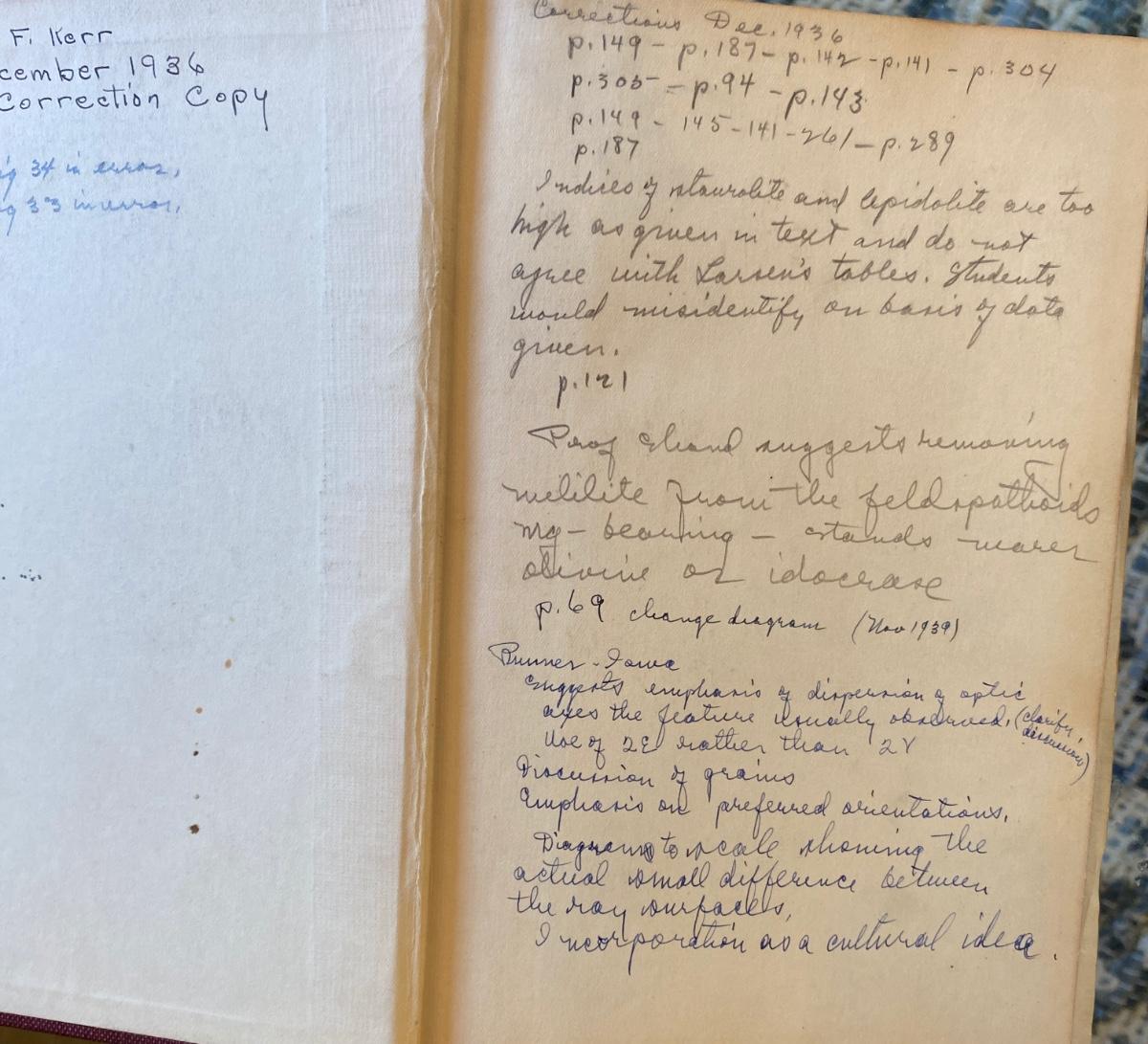 the book is inscribed by Prof. Kerr as PAUL F. KERR , Correction Copy, Dec. 1936 and has notes and changes throughout in his handwriting both on the pages and included notes. Has sticker on spine with PFK on it referencing his personal library. sort of soiled and a little sticky but interior good condition. The original book he used as he Correction copy was the First Ed. third printing of the original Thin -Section Mineralogy book