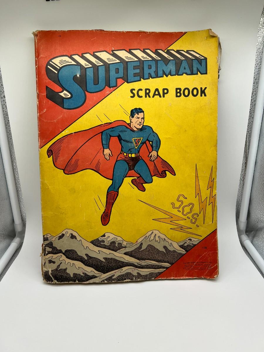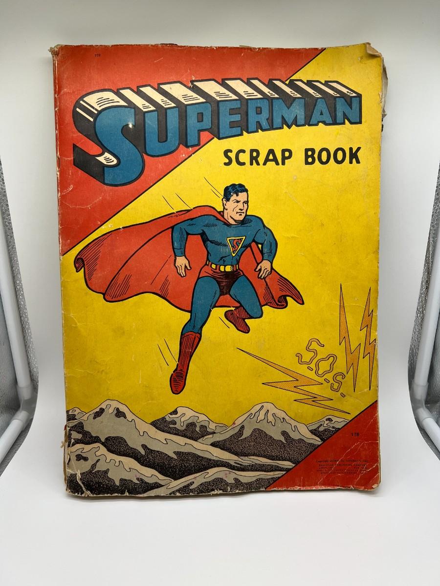 Rare 1940s Superman Scrapbook with Vintage News and Photo Clippings Ephemera. Cover says this is issue 178, copyright MCMXL by Superman Inc., Saalfield Publishing Company. Made in the United States of America. Condition as shown.