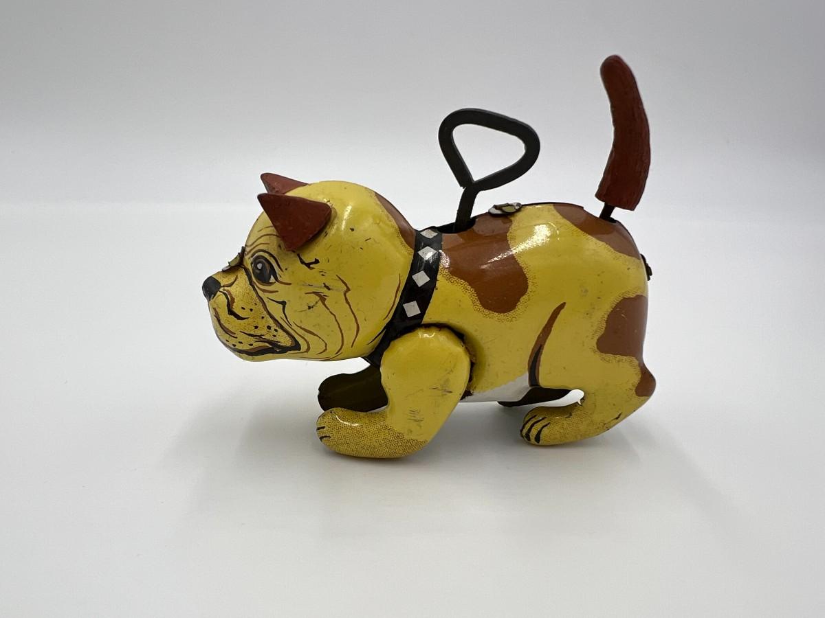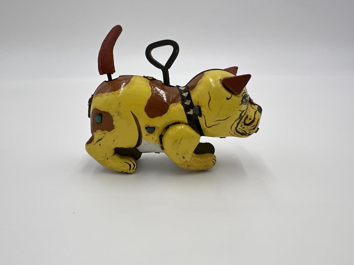 Rare 1950s Japan Wind Up Bulldog Tin Toy. Working condition, tail spins quickly after wound. Condition as shown.