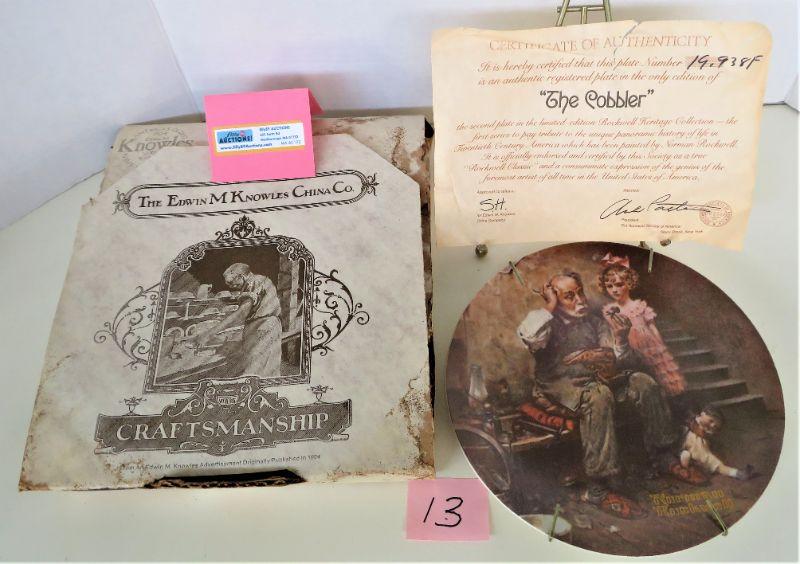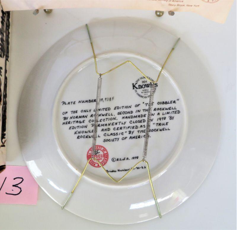 nice 1978 Norman Rockwell "The Cobbler" Plate # 19.93F w/ Certificate Of Authenticity with attached Plate Holder & Original Shipping Box (note: see Photo - Box in worn condition. 2nd in the Rockwell Heritage Collection - Handmade Closed in 1978. Measures 8.5" diameter. Please preview and email questions / concerns prior to bidding. In Good Condition for its age.