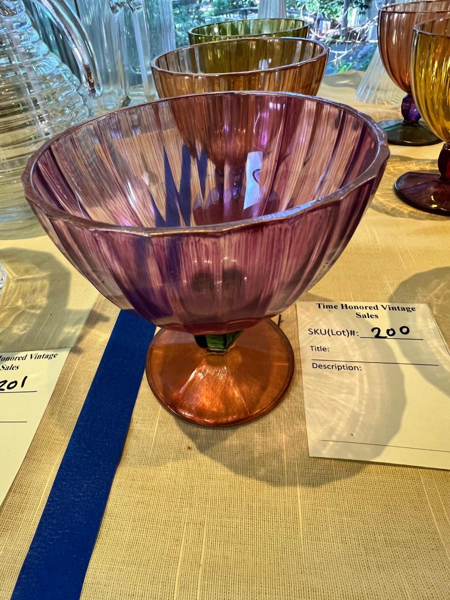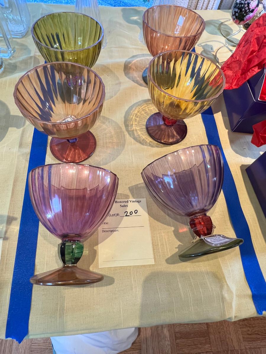 6 Vintage ( est 1960s) Hand Painted Glassware Bohemian Metropolitan Standard. and 2 tall glass candle holders 3 colors applied to each.