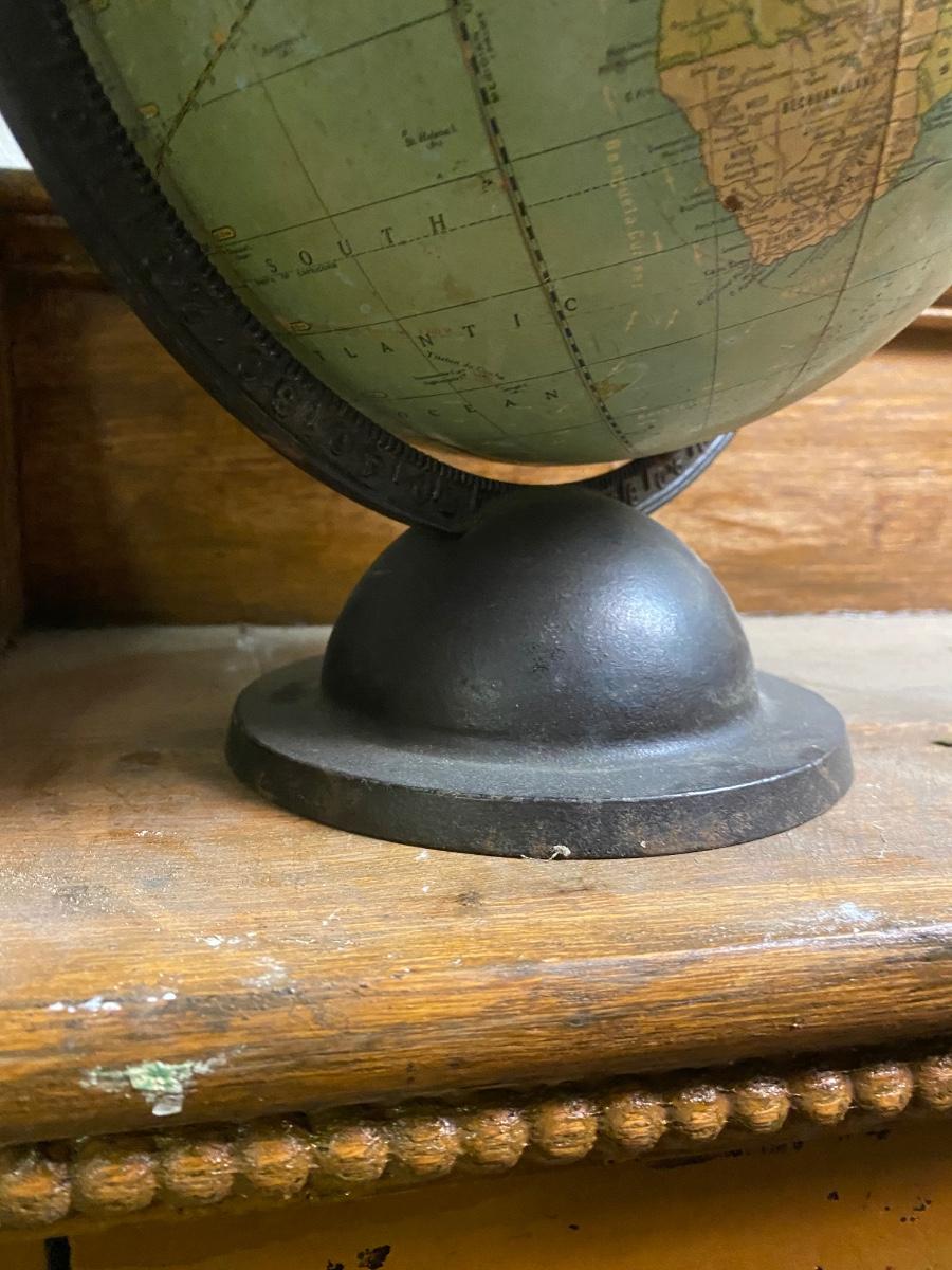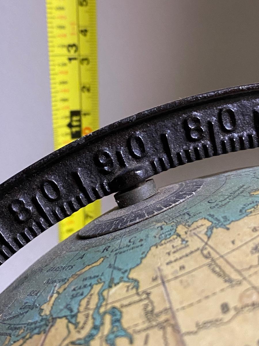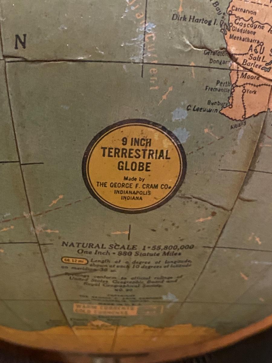 Rare 9 Inch Terrestrial Globe George F Cram-Indianapolis IN,Bronzed cast iron rotating full axis . Approx 13" with stand. Please look at photos for surface issues.