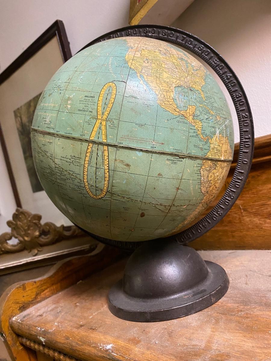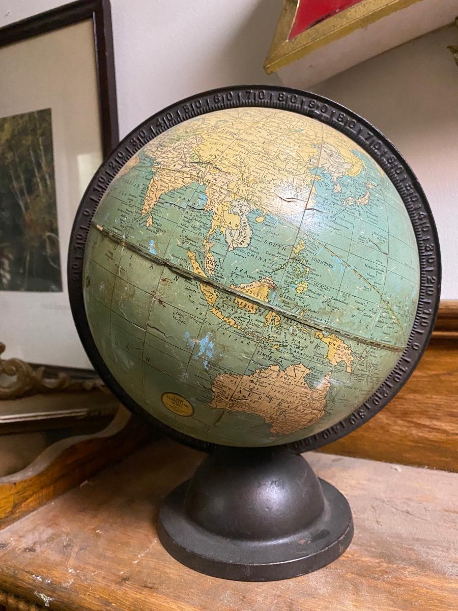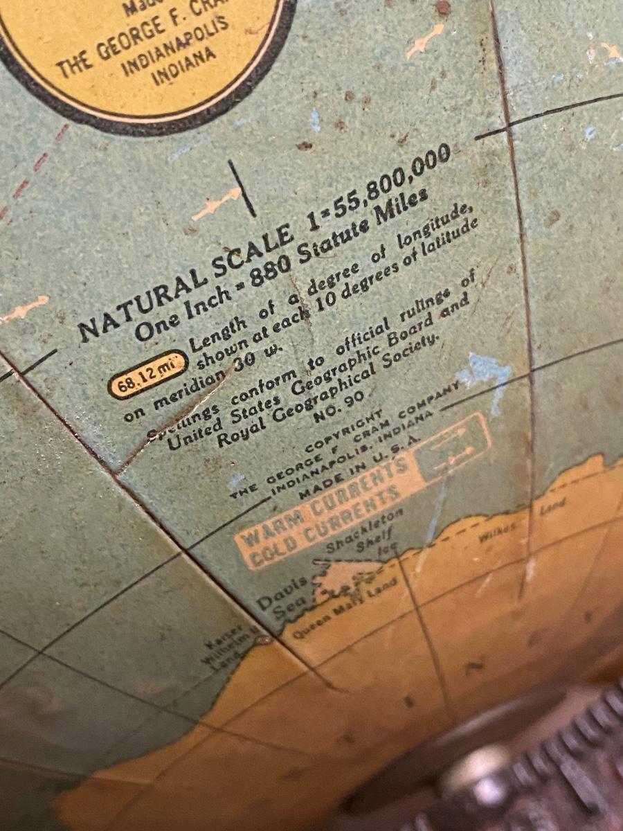 Rare 9 Inch Terrestrial Globe George F Cram-Indianapolis IN,Bronzed cast iron rotating full axis . Approx 13" with stand. Please look at photos for surface issues.