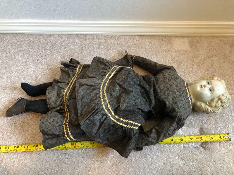Rare antique Greiner's patent doll head. Dressed in outfit (missing one shoe). Hands show sign of wear, as does the face (please review images carefully). Estate family heirloom.