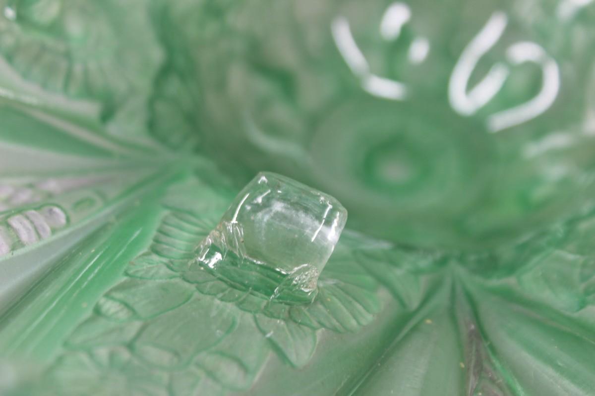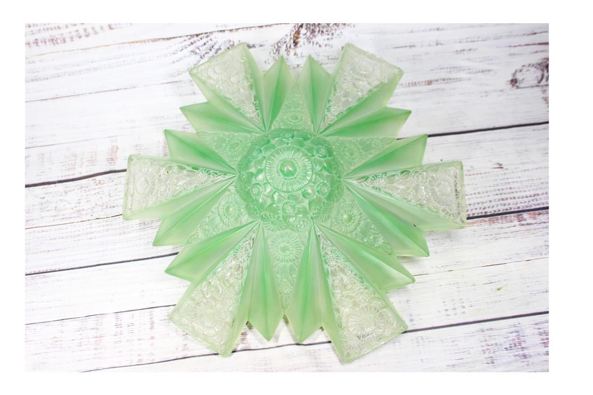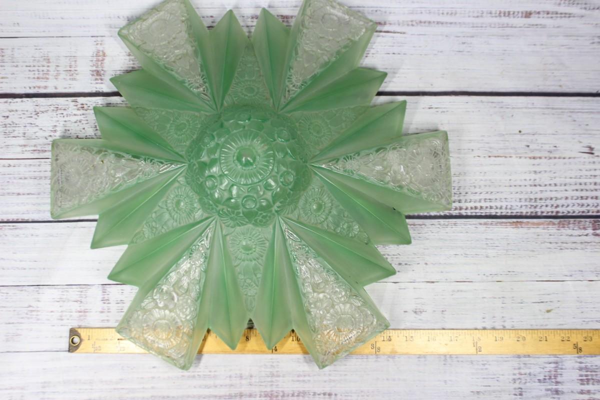 Antique Modernizer Art Deco Frosted Green Glass Hanging Green Lamp Shade, this is an extremely rare 18 inch wide Consolidated Art Glass Modernizer slip shade. There are 2 tiny spots along the edge that have a tiny chip -see pics.