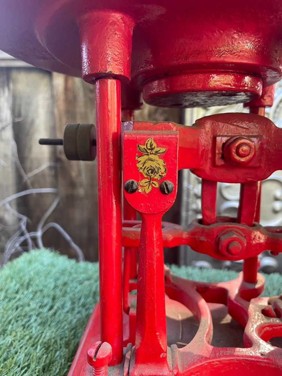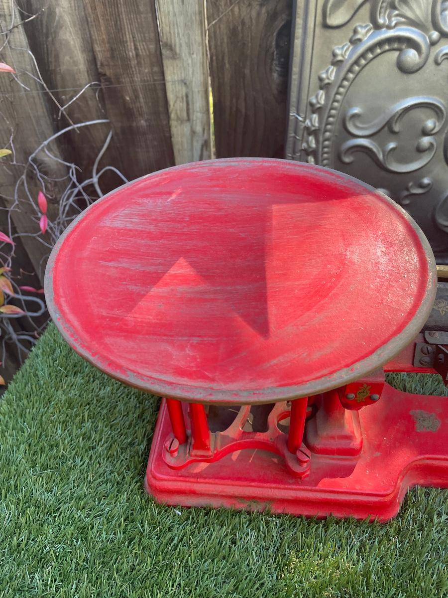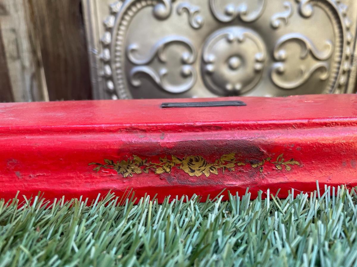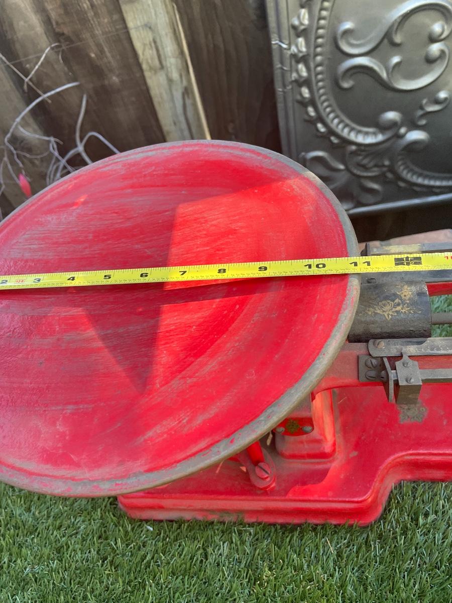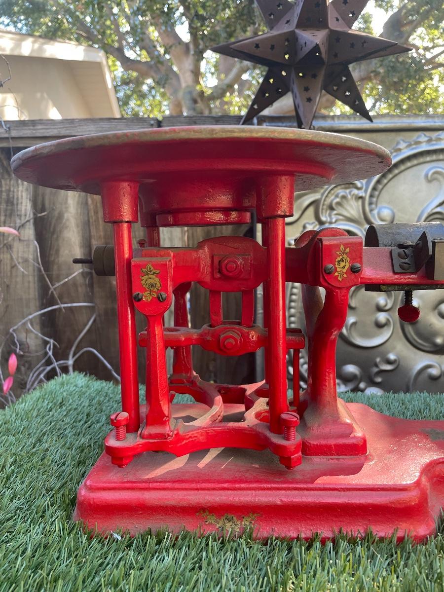 Beautiful fire engine red color with gold floral designs throughout scale. See pictures for details, very heavy!