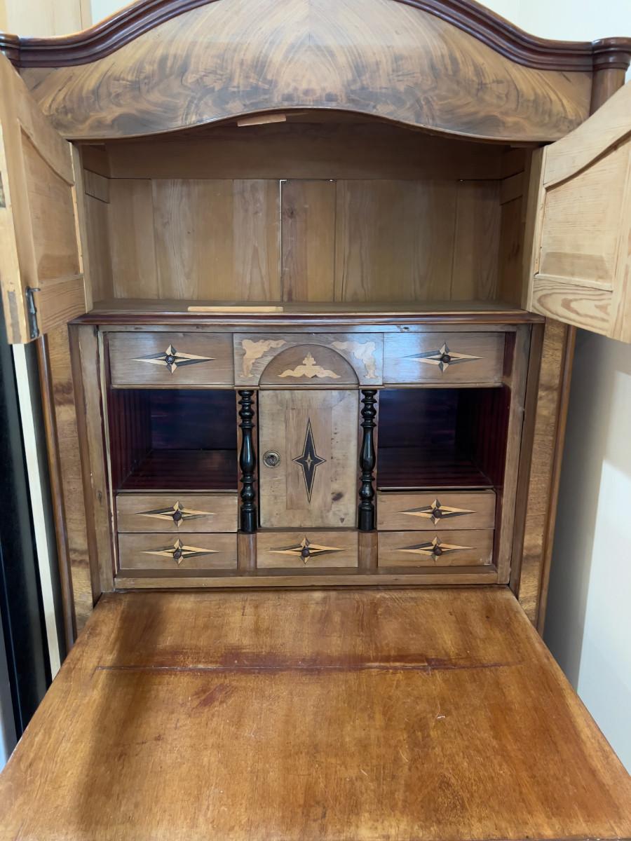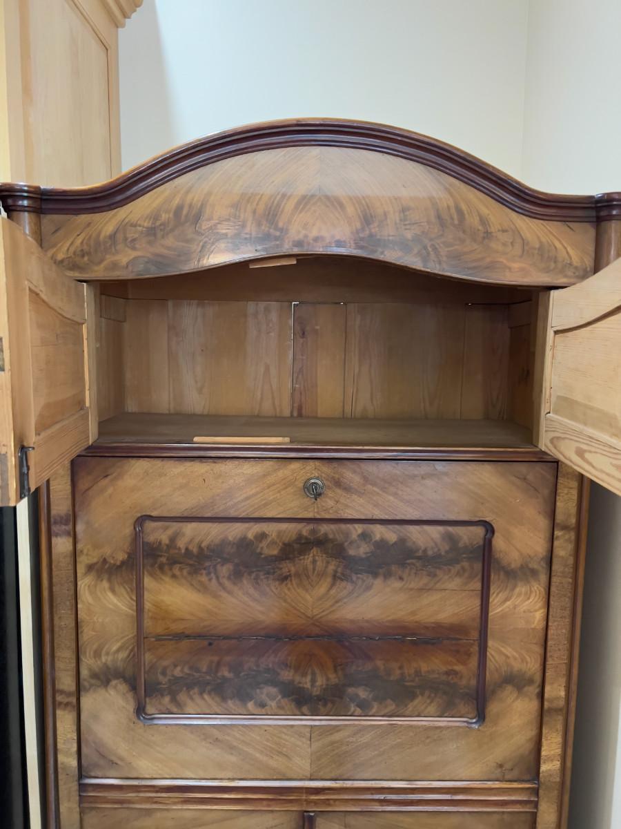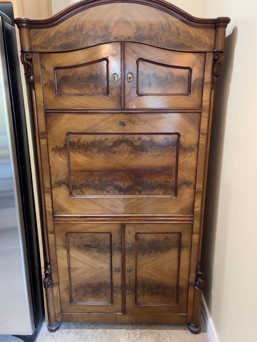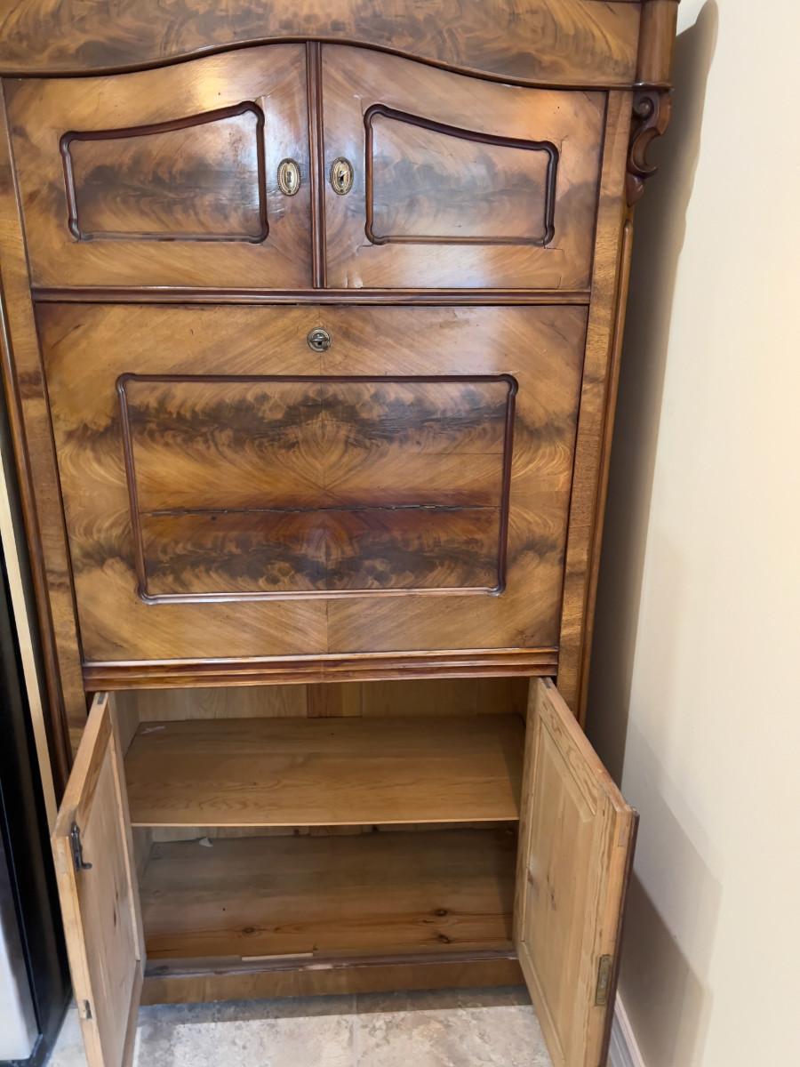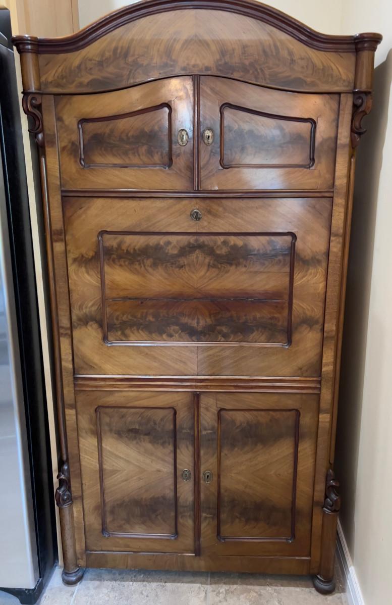 Rare Antique Flame Walnut European Secretary Desk, beautiful condition with the original keys, there is some wear and shrinkage which is to be expected on this early 20th century piece. This item was shipped from Germany by the original owner. Measures 36" wide 19" deep and 74" tall.