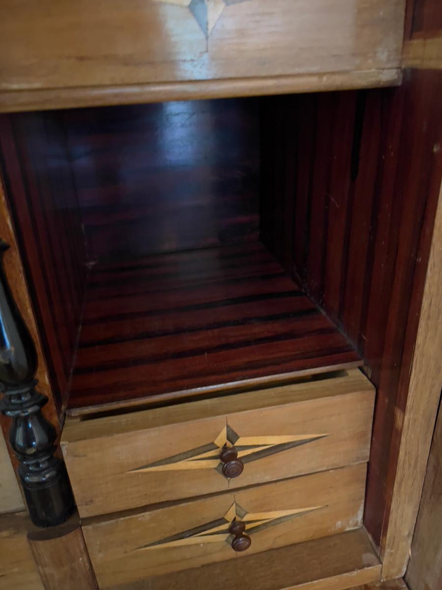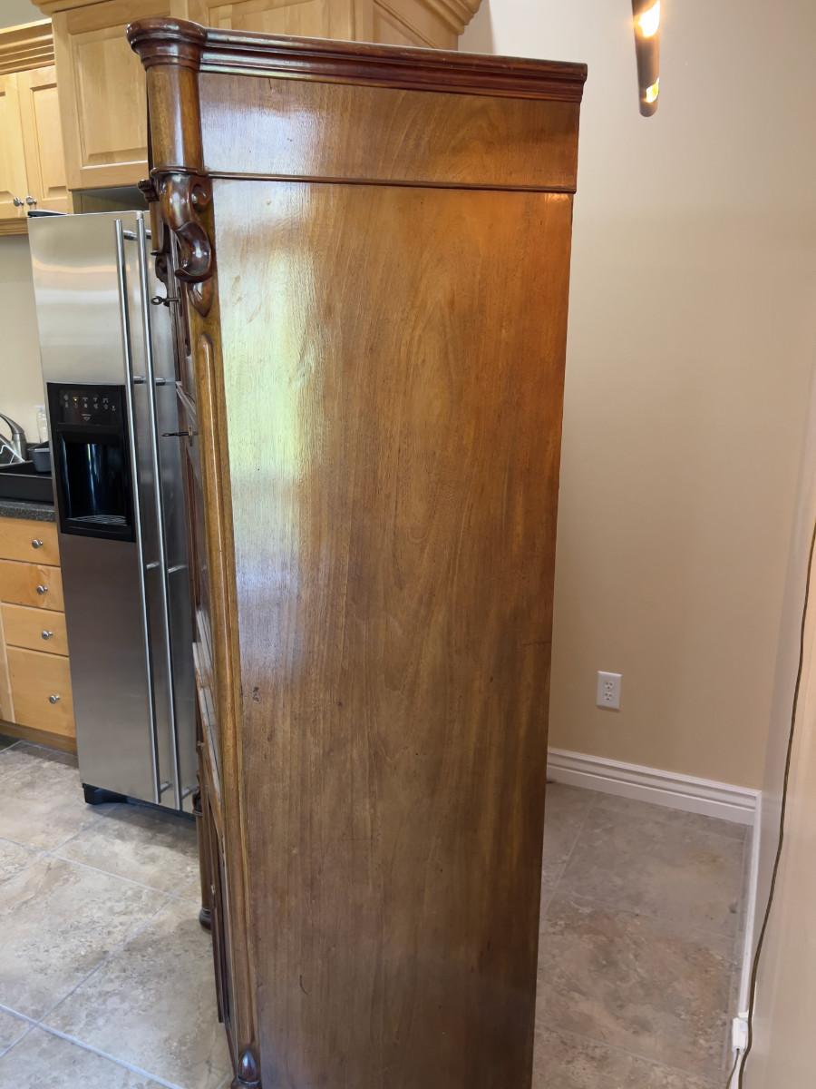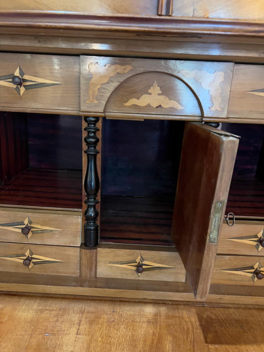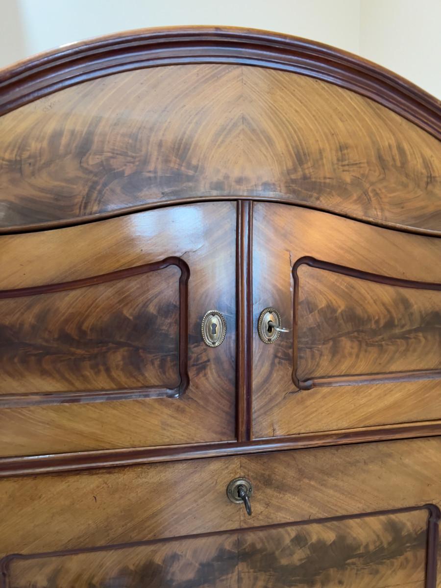 Rare Antique Flame Walnut European Secretary Desk, beautiful condition with the original keys, there is some wear and shrinkage which is to be expected on this early 20th century piece. This item was shipped from Germany by the original owner. Measures 36" wide 19" deep and 74" tall.