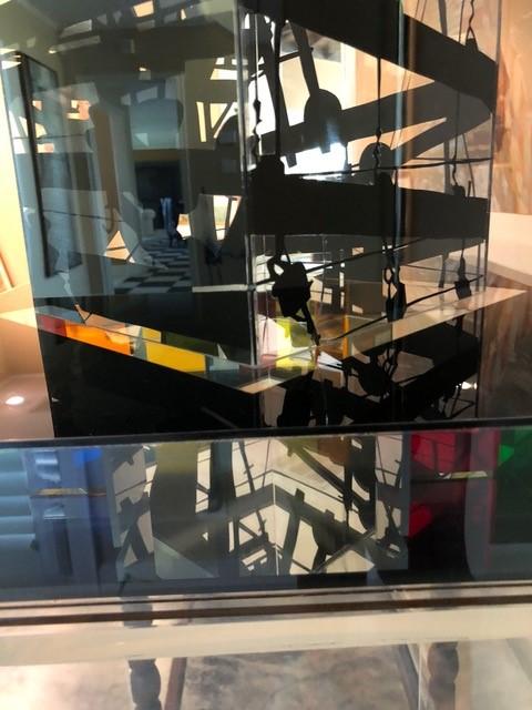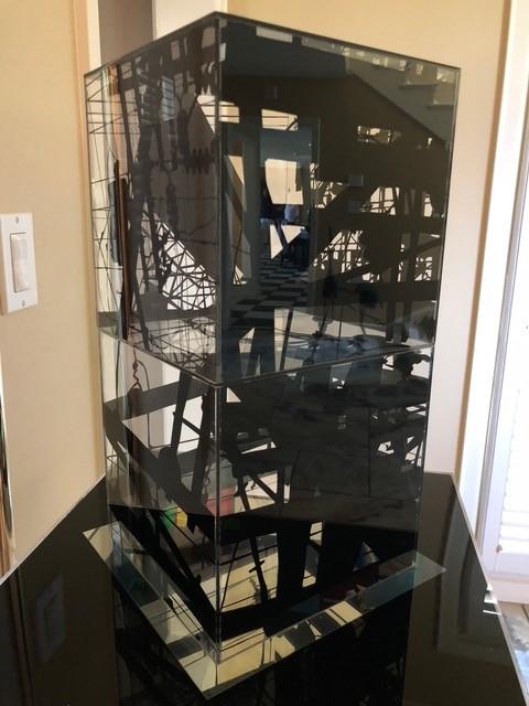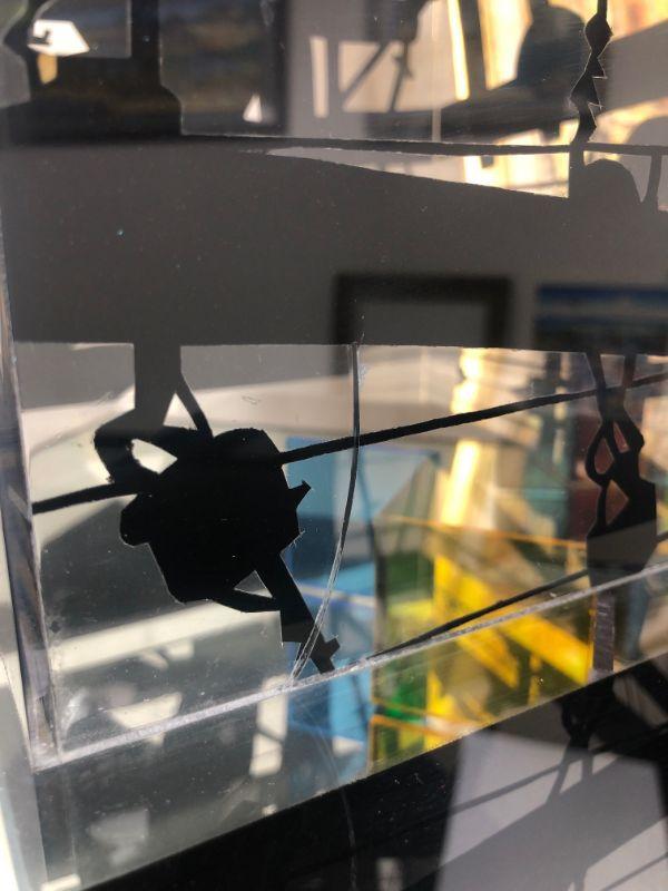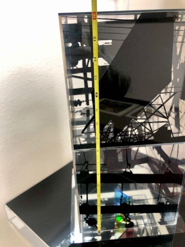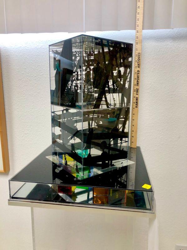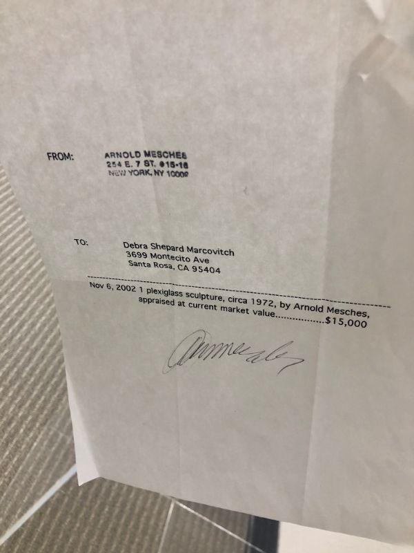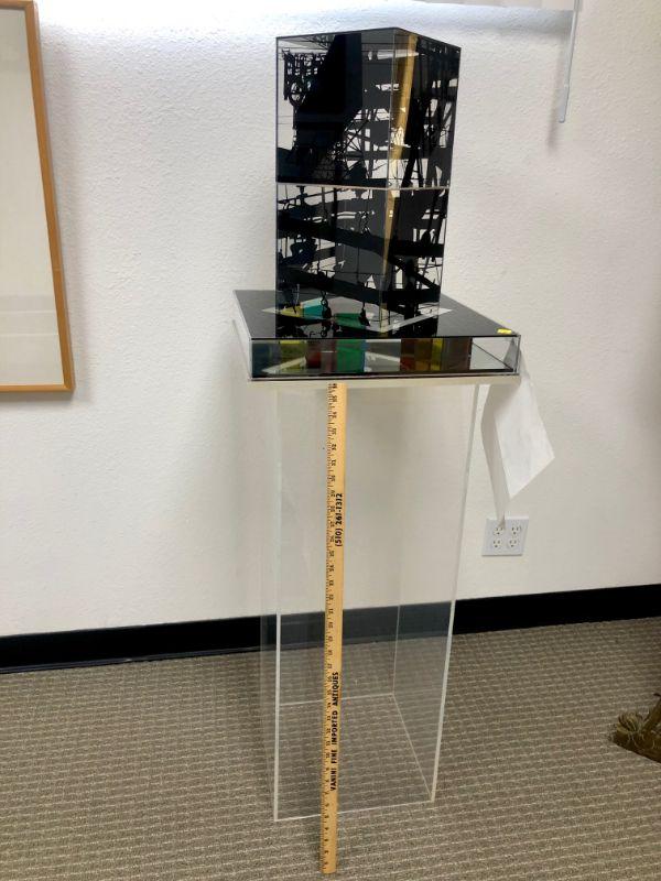 A rare and unique piece of plexiglass modernist art by Arnold Mesches, circa 1972. The geometric shapes of the outer structure are combined with abstract industrial shapes within, and hints of color from below. Every side and perspective looks different. Comes with custom plexiglass stand. One visible crack in the plexiglass (shown in photo), otherwise very good condition.