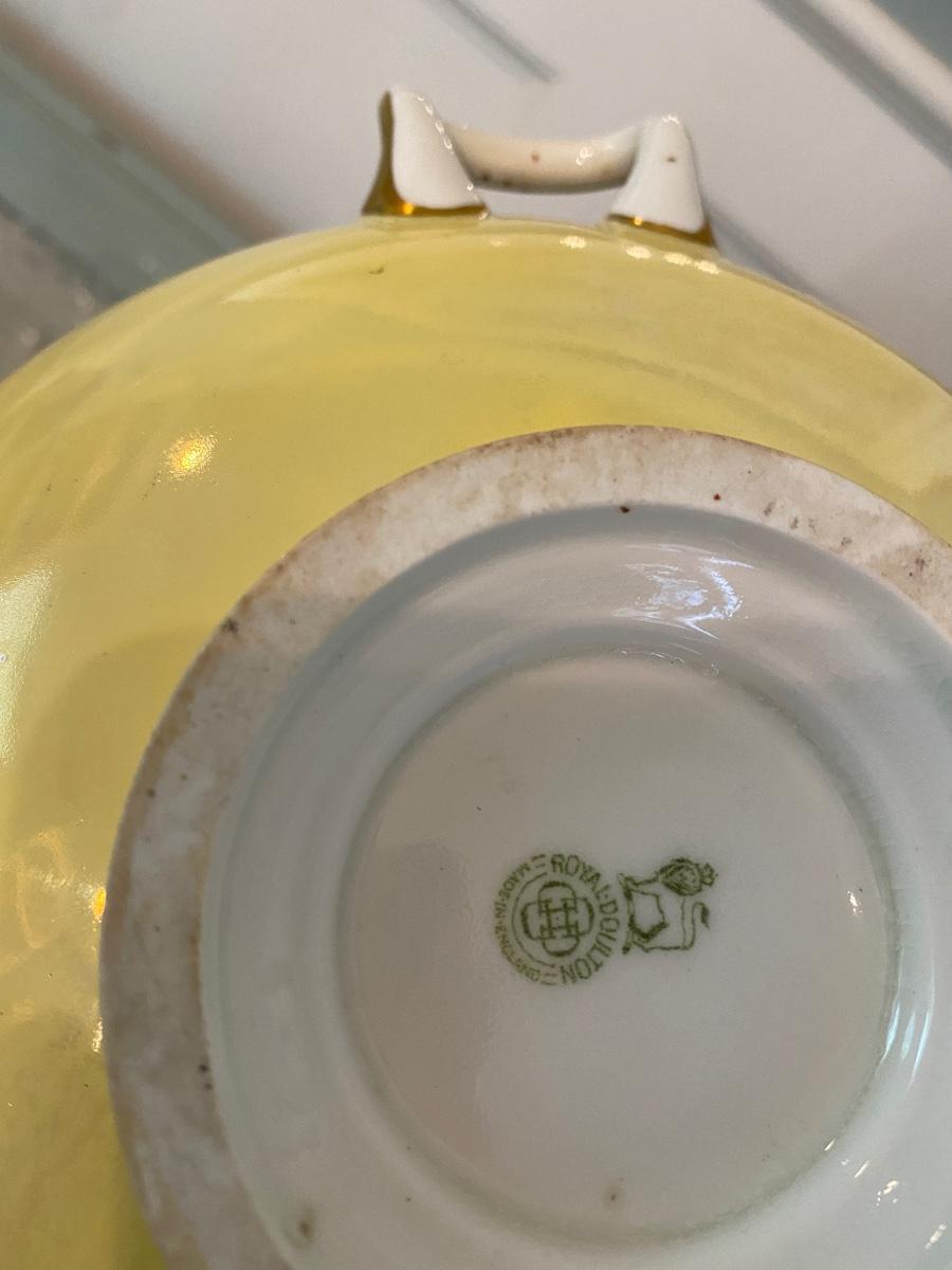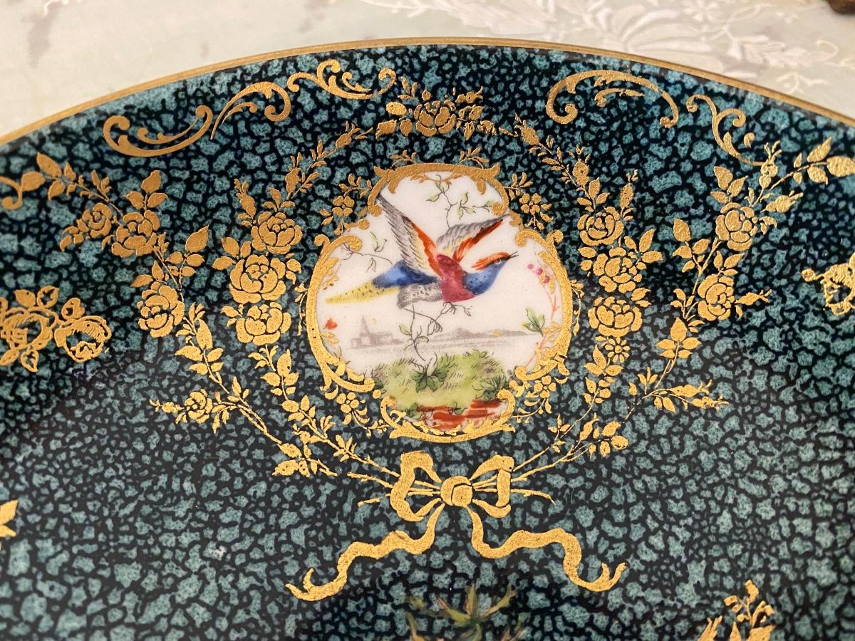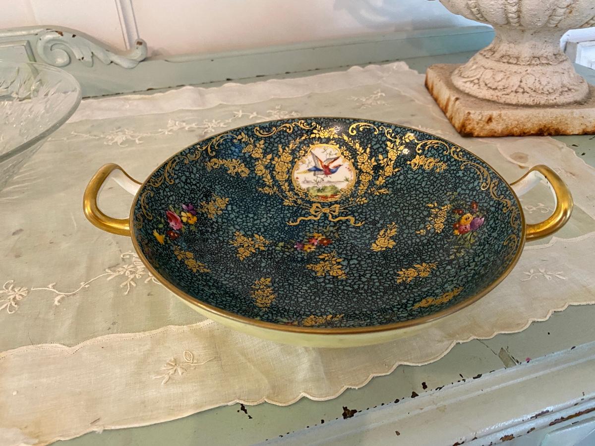 Very scarce c. 1928 handprinted, enameled handled serving bowl by Royal Doulton. Pebbled aqua background, cartouche featuring handprinted peacock in flight, hand gilt bow and roses/scrolling. Yellow underside. Excellent condition. 9.25" across, 8" diameter bowl, 2 2/3" tall.