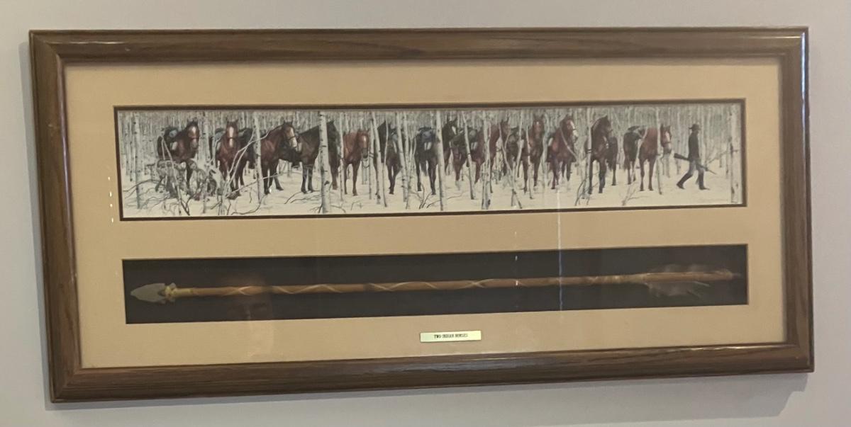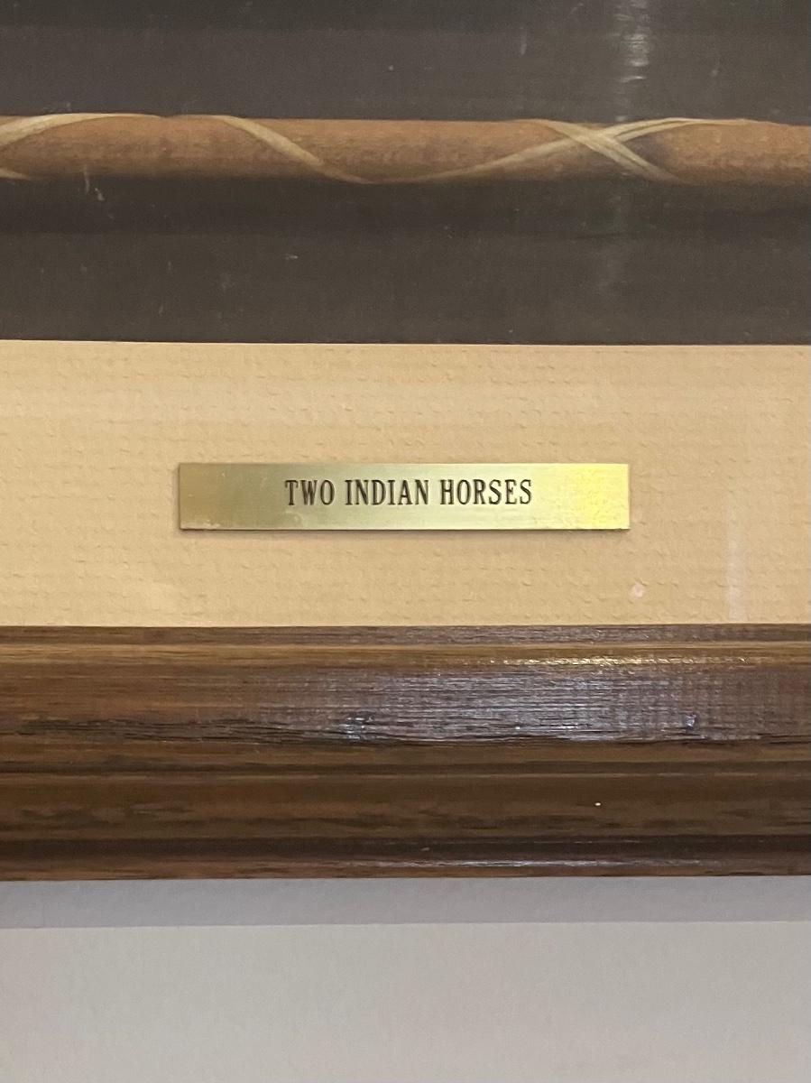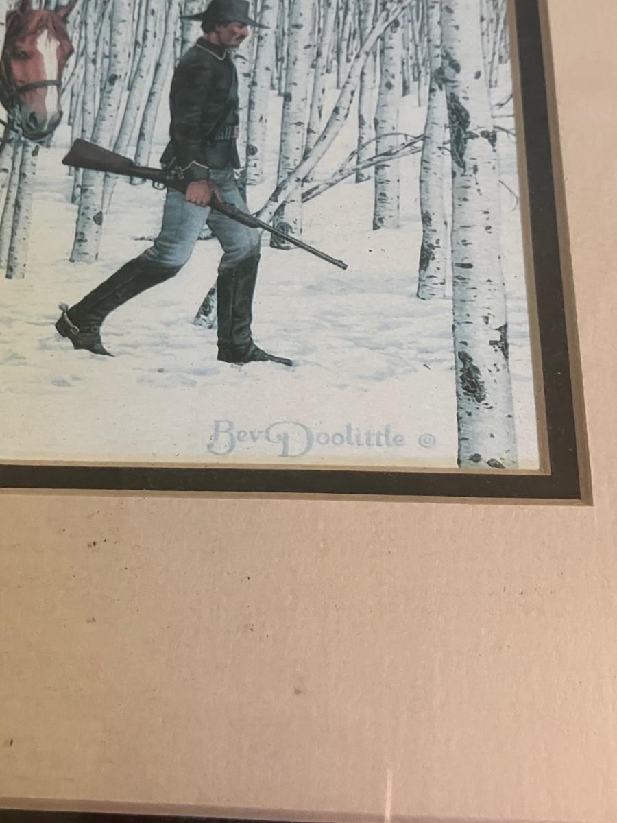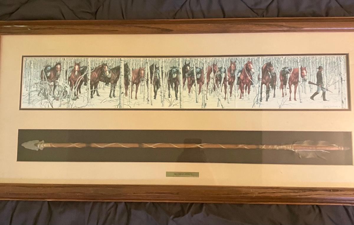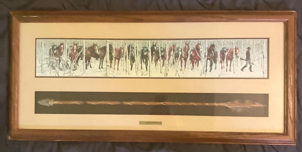 Discover the enchanting illusion of Bev Doolittle's The Forest Has Eyes (1984), a cornerstone of American Western art where a lone frontiersman and his horse navigate a birch forest alive with hidden Native American faces peering from the trees. This captivating lithograph print—signed in the plate by the artist—measures approximately 28" x 11" (image with mat) and is housed in a stunning custom walnut frame (overall 32" W x 15" H). What sets this piece apart is the integrated lower compartment displaying a genuine 19th-century Plains Indian arrow with hand-knapped stone arrowhead, evoking the perilous wilderness theme and adding authentic artifact allure.