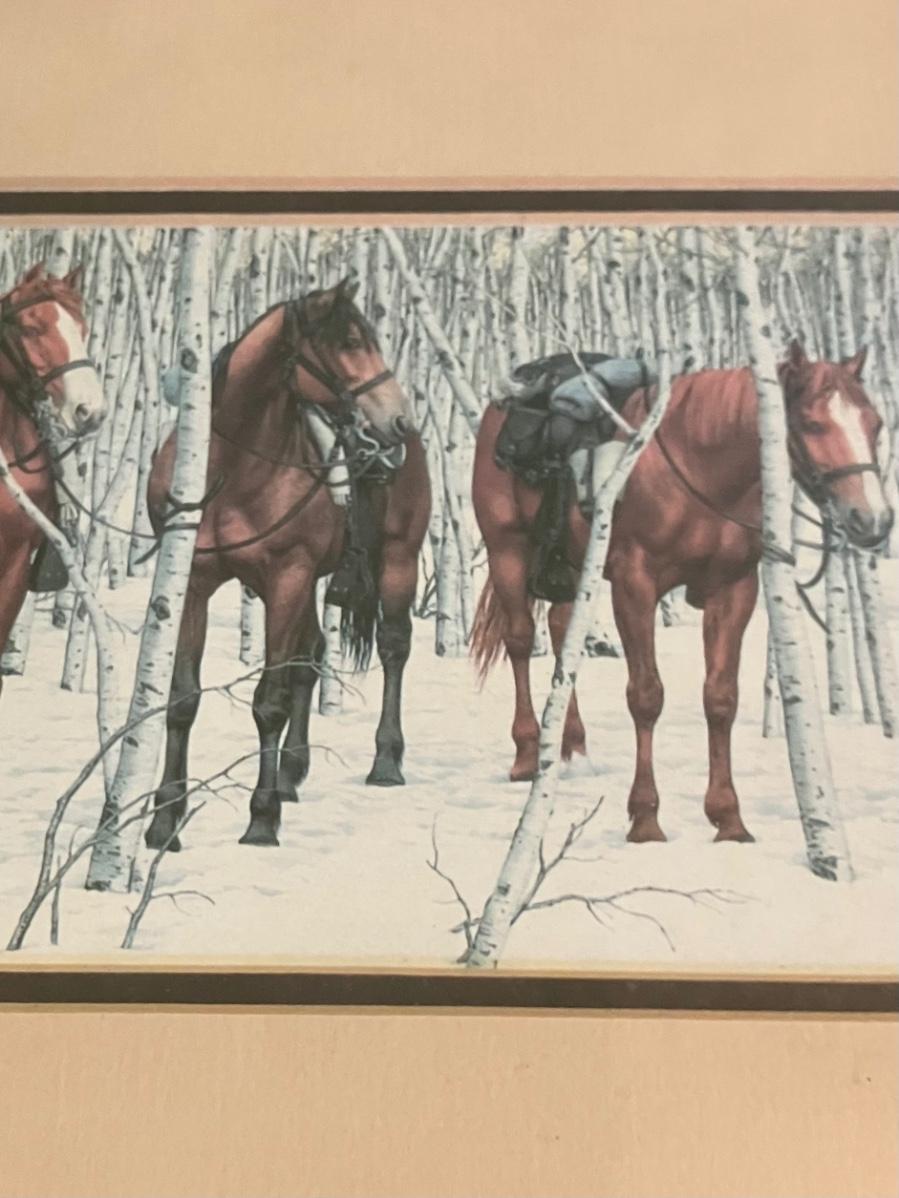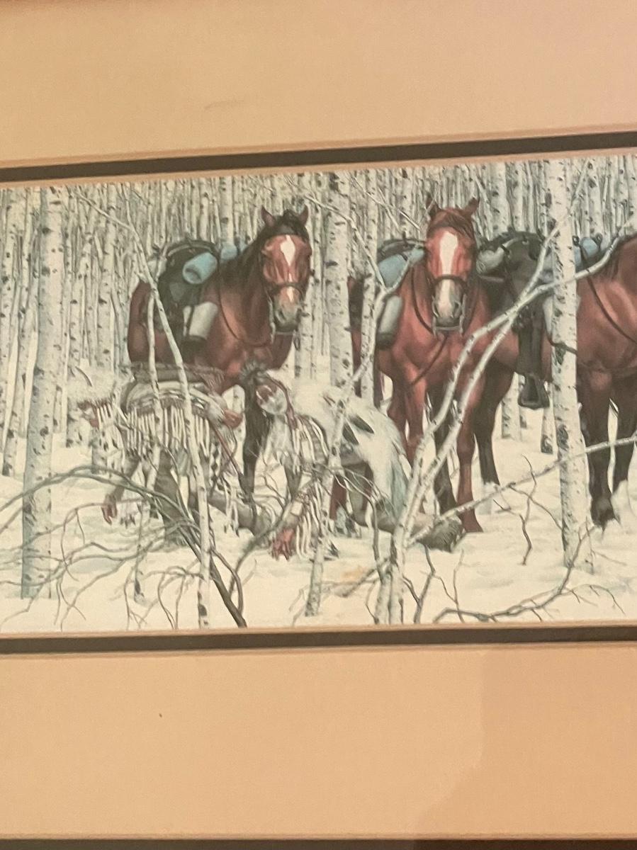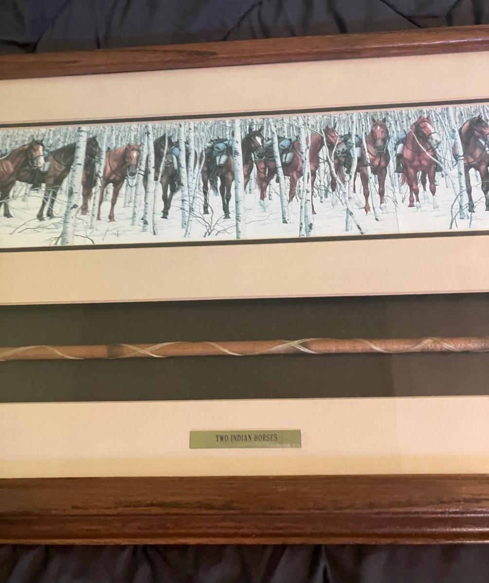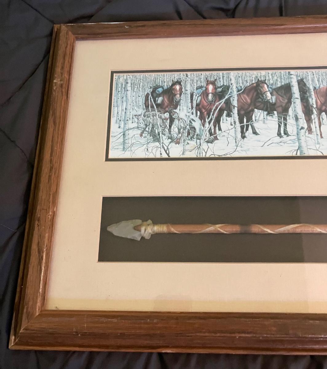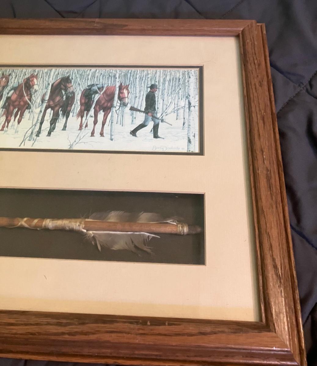 Discover the enchanting illusion of Bev Doolittle's The Forest Has Eyes (1984), a cornerstone of American Western art where a lone frontiersman and his horse navigate a birch forest alive with hidden Native American faces peering from the trees. This captivating lithograph print—signed in the plate by the artist—measures approximately 28" x 11" (image with mat) and is housed in a stunning custom walnut frame (overall 32" W x 15" H). What sets this piece apart is the integrated lower compartment displaying a genuine 19th-century Plains Indian arrow with hand-knapped stone arrowhead, evoking the perilous wilderness theme and adding authentic artifact allure.