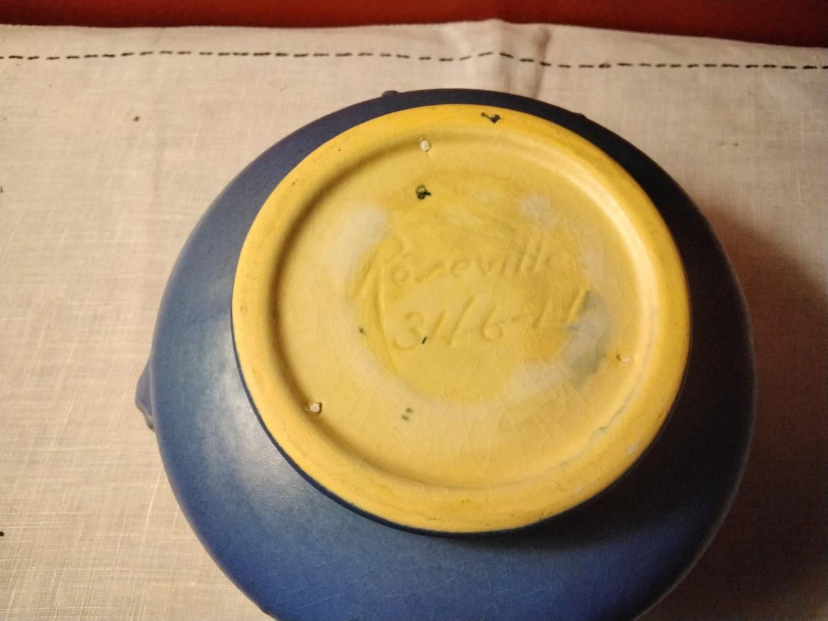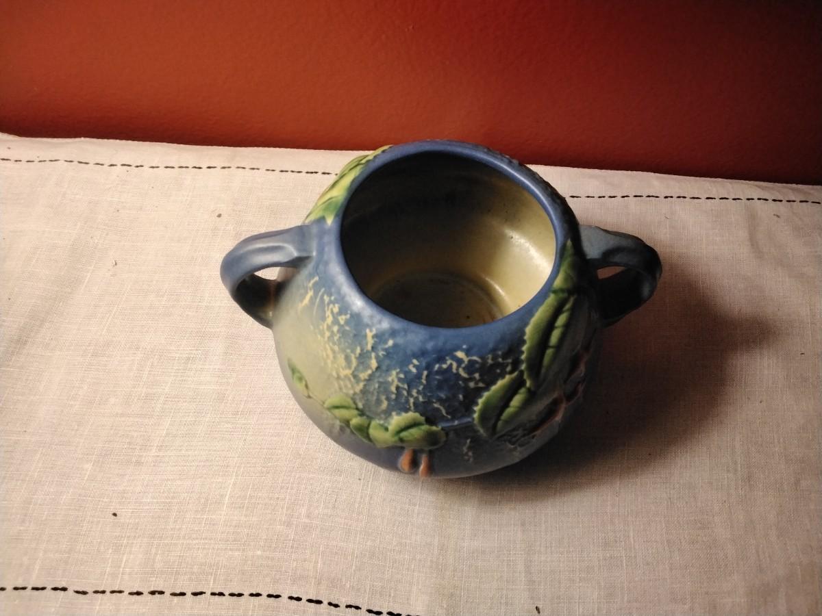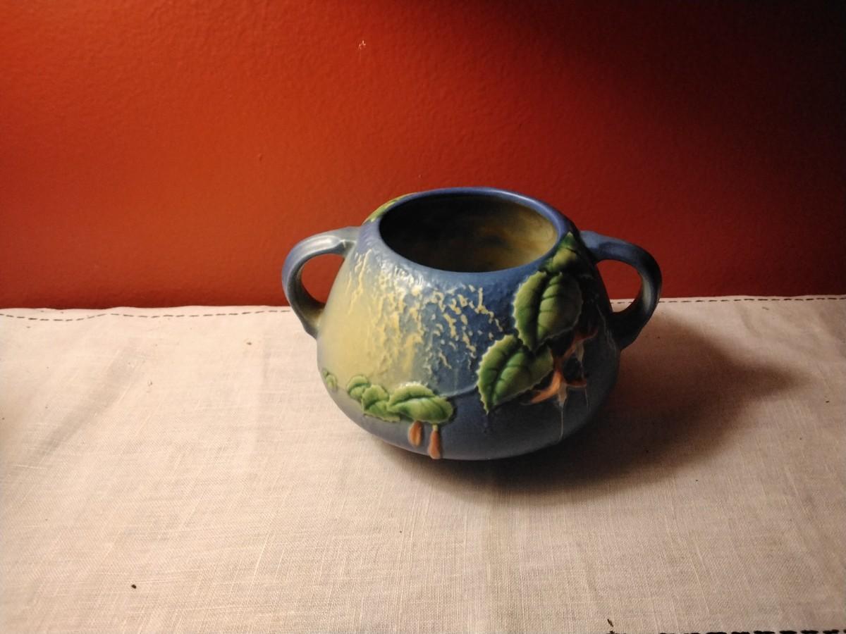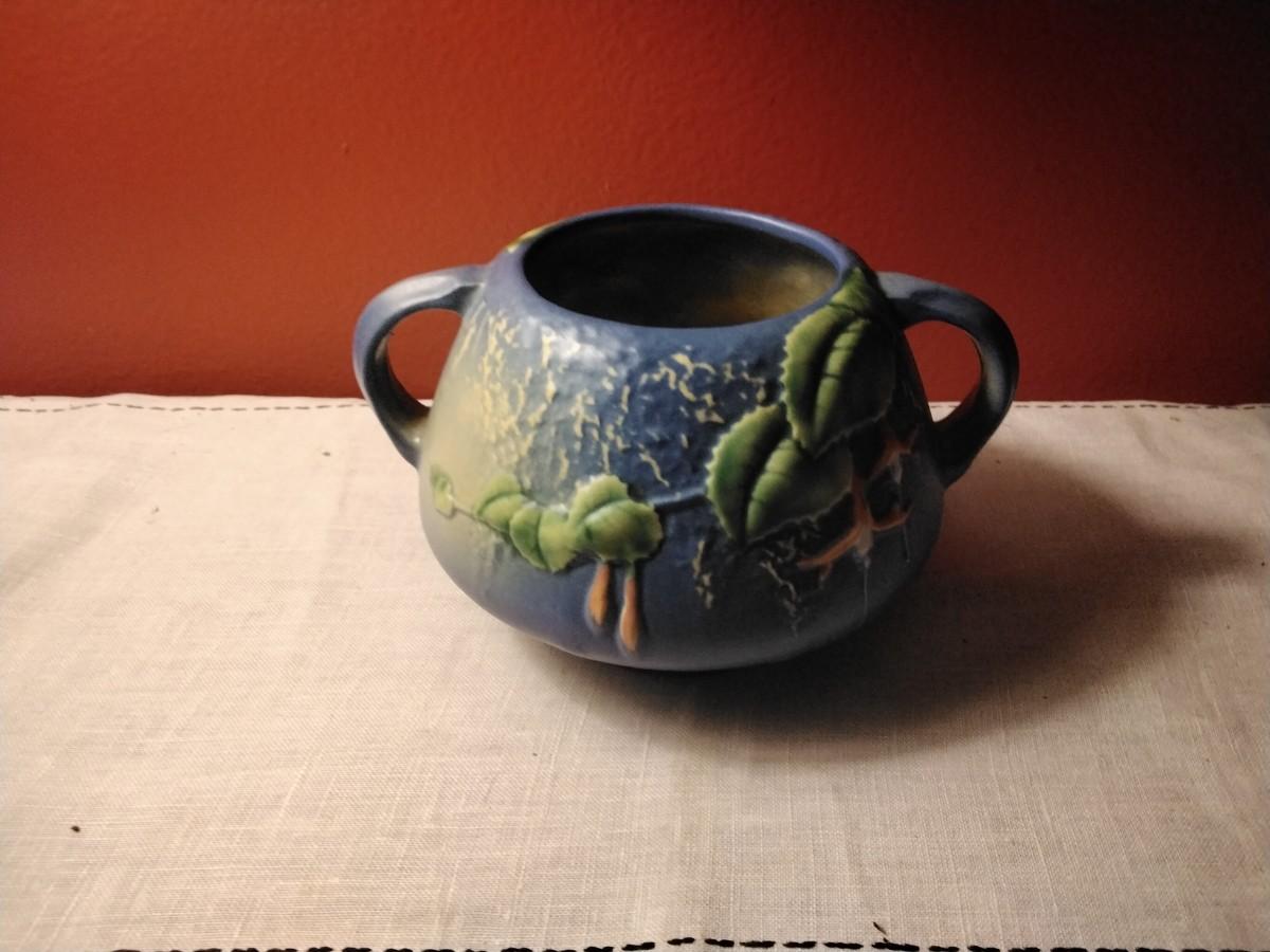are Brlue Fuchsia Roseville Pottery handled Bowl 346 c1938