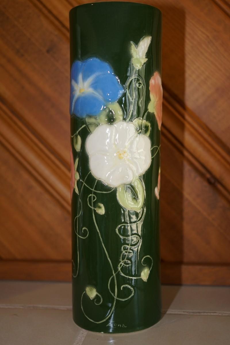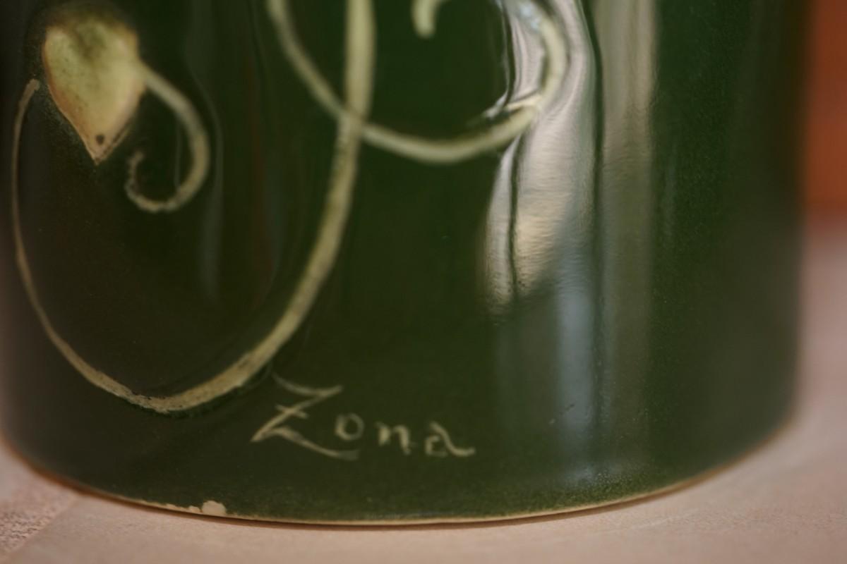 the vase is with raised florals hand painted. Signed near the base rim "Zona" who happened to be Valentino Liberace's step mother who worked at Ceramic Arts Studio in the 1950's