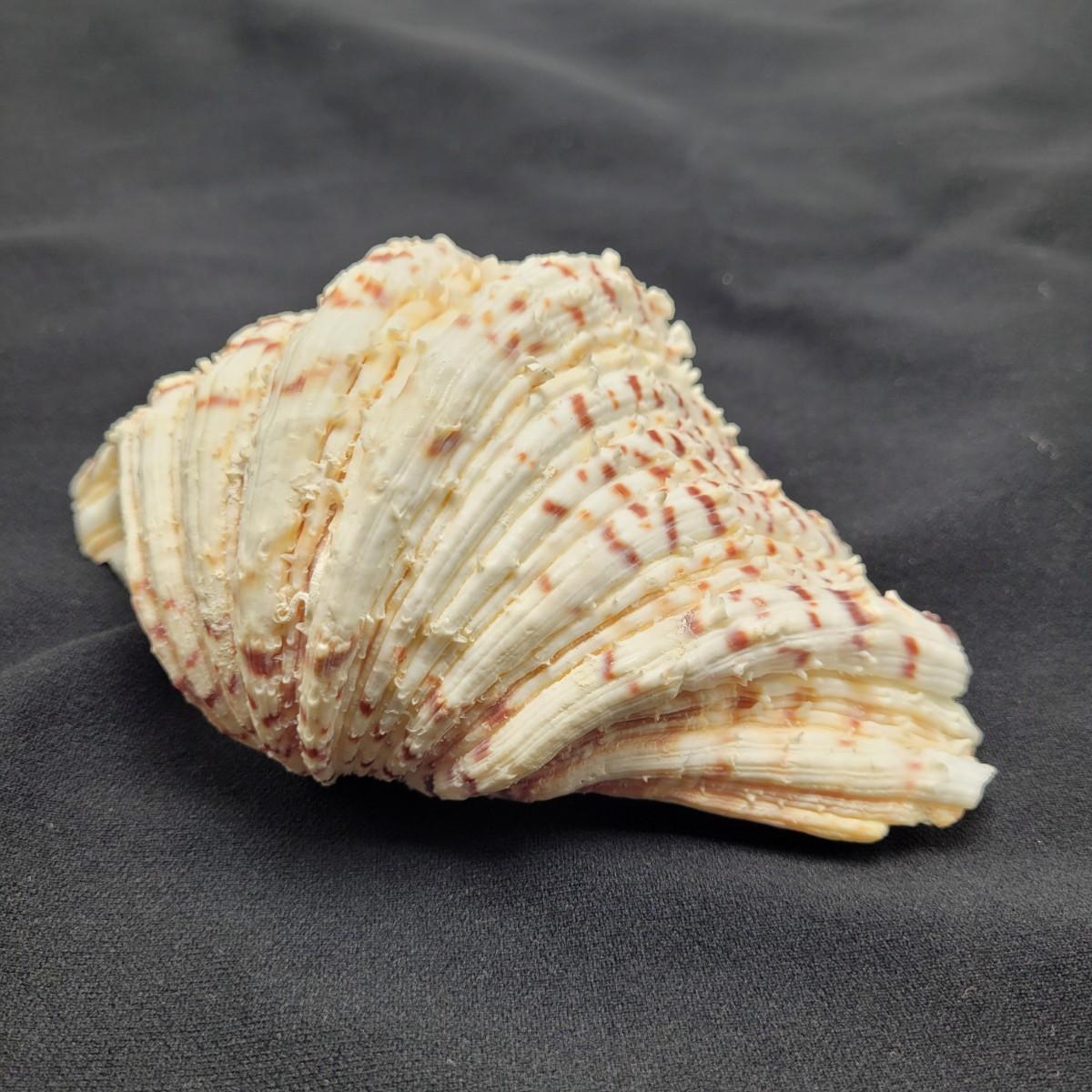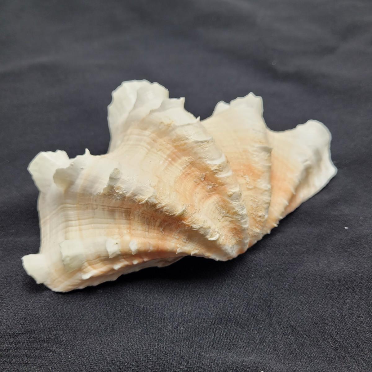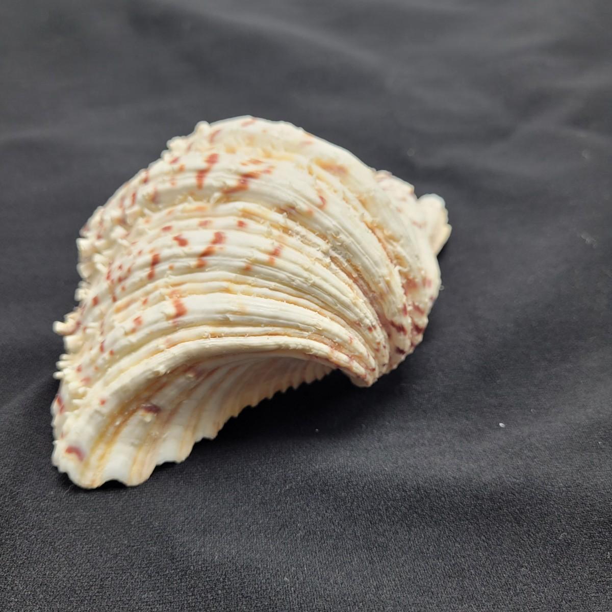 This lot includes six seashells of different types. The two main attractions are two half clamshells. One appears to be a strawberry hippopus clamshell that measures 6.5" x 4.5" x 3"H. The second is a more common half clamshell in off white that measures 6" x 4" x 2"H. Also included is another clam shell and three smaller full scallop shells in red, yellow, and white.