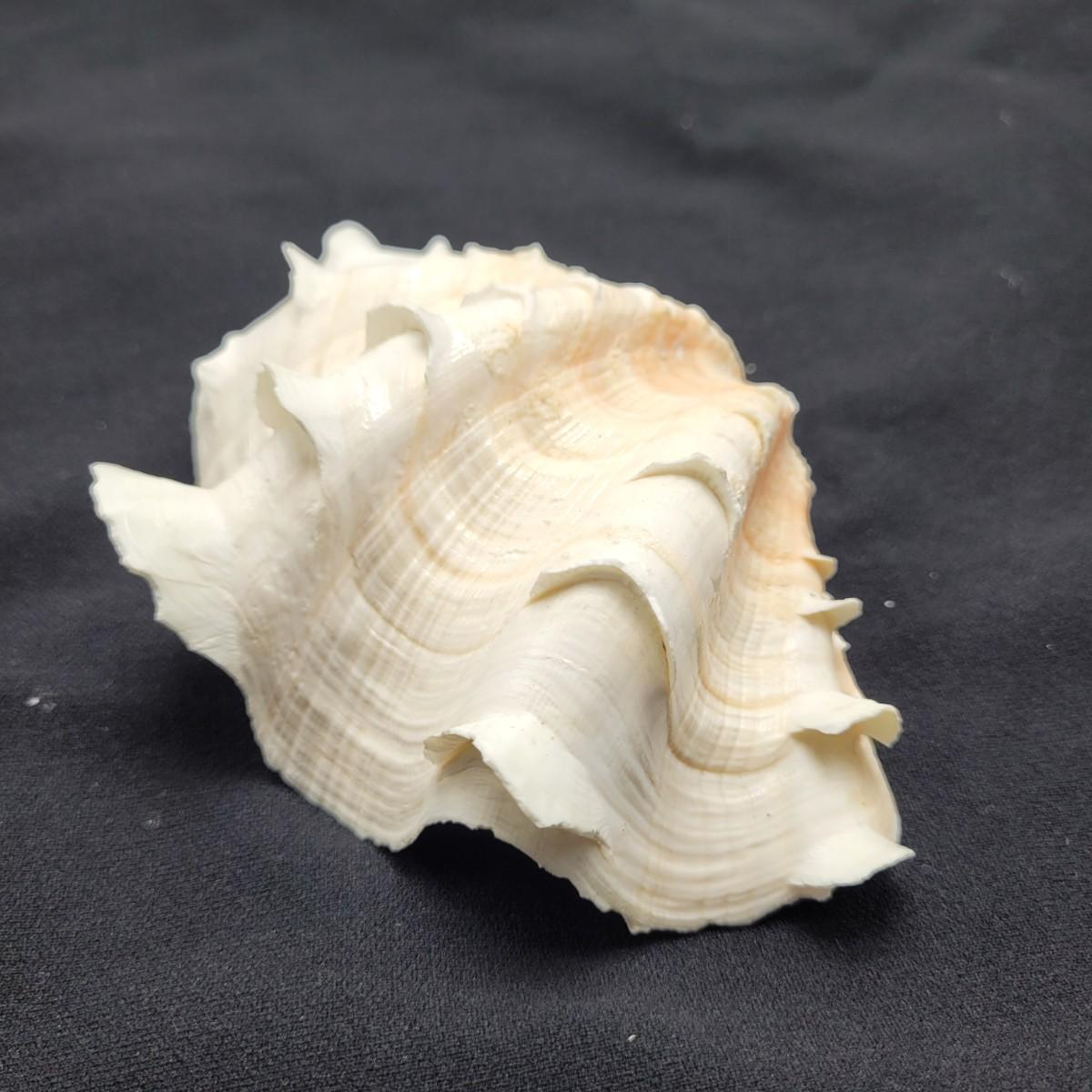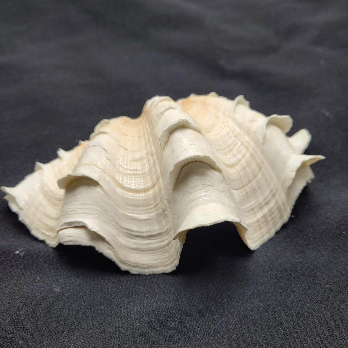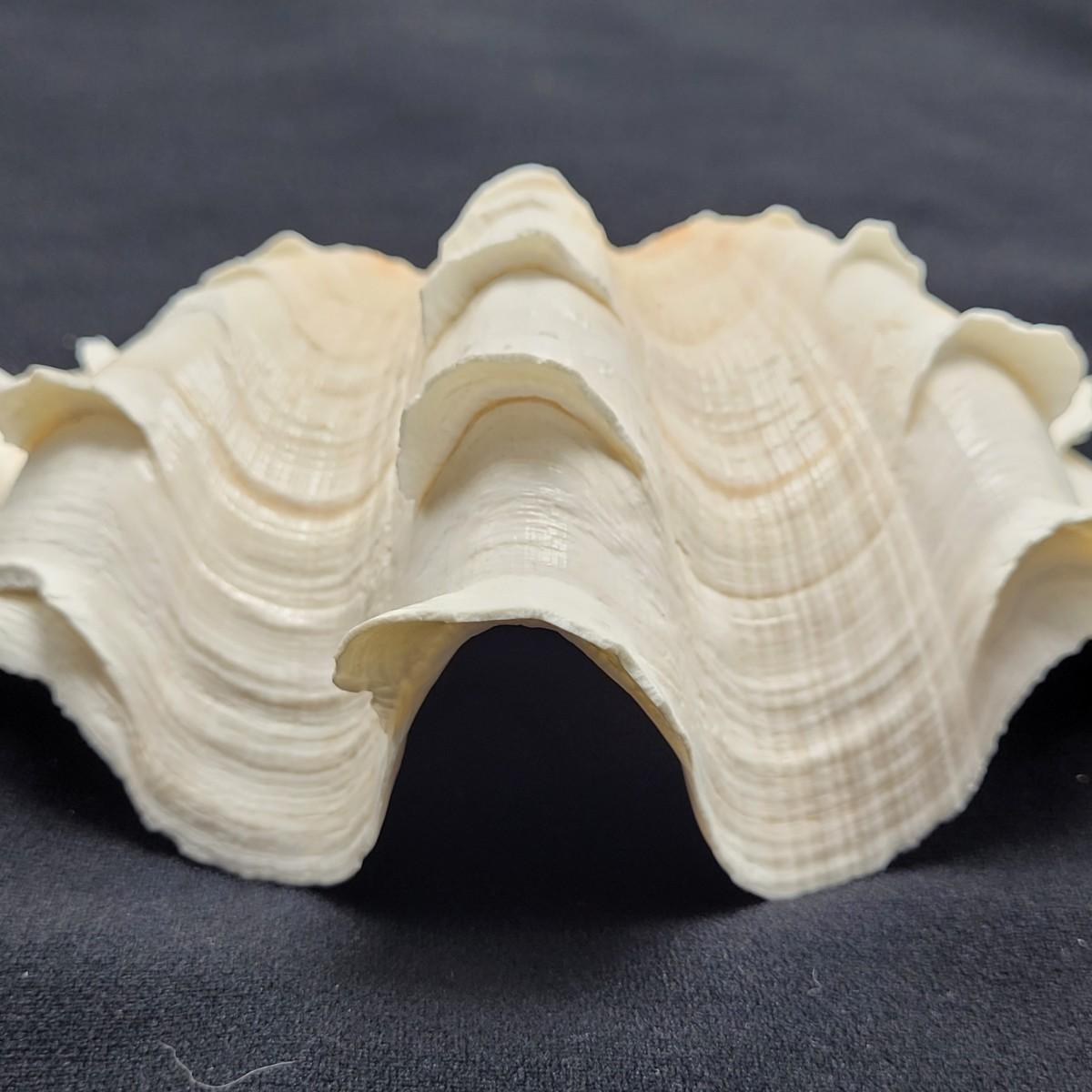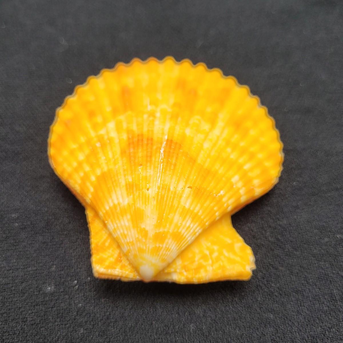 This lot includes six seashells of different types. The two main attractions are two half clamshells. One appears to be a strawberry hippopus clamshell that measures 6.5" x 4.5" x 3"H. The second is a more common half clamshell in off white that measures 6" x 4" x 2"H. Also included is another clam shell and three smaller full scallop shells in red, yellow, and white.