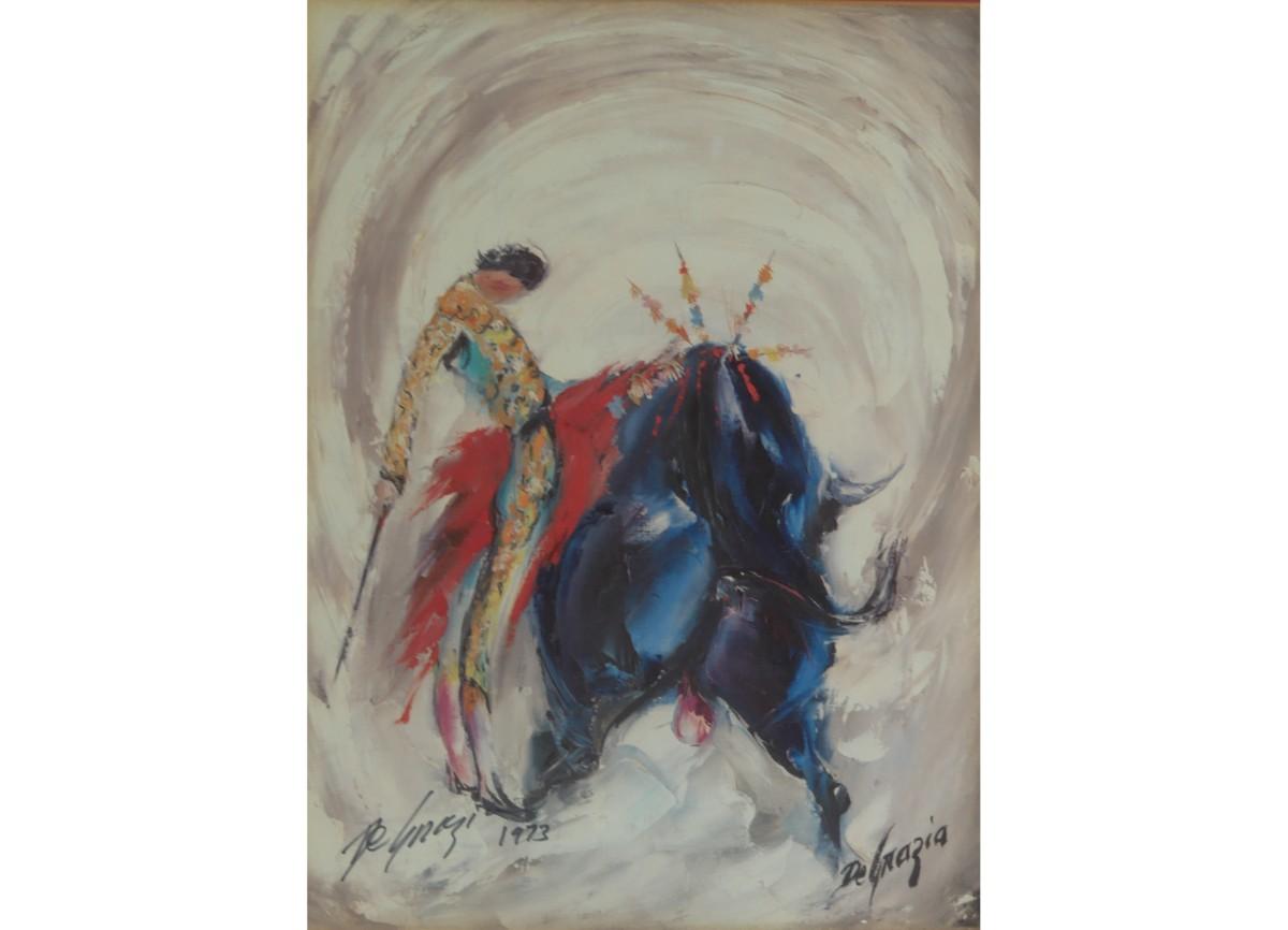 RARE! Stunning print of DeGrazia's original "Classic Natural" oil on canvas, 1966. Double signed, one print signature and one handwritten signature, "DeGrazia 1973". Scene depicts matador with large black bull. Professionally framed with gorgeous purple and red motifs to match the painting. In excellent condition. Matting has slight fading due to age. Artwork measures 11.75" x 16". Total frame measures 20" x 24" x 1.5". (A9) *For shipping, this lot will have a $30 boxing fee applied*