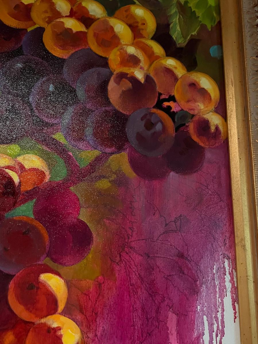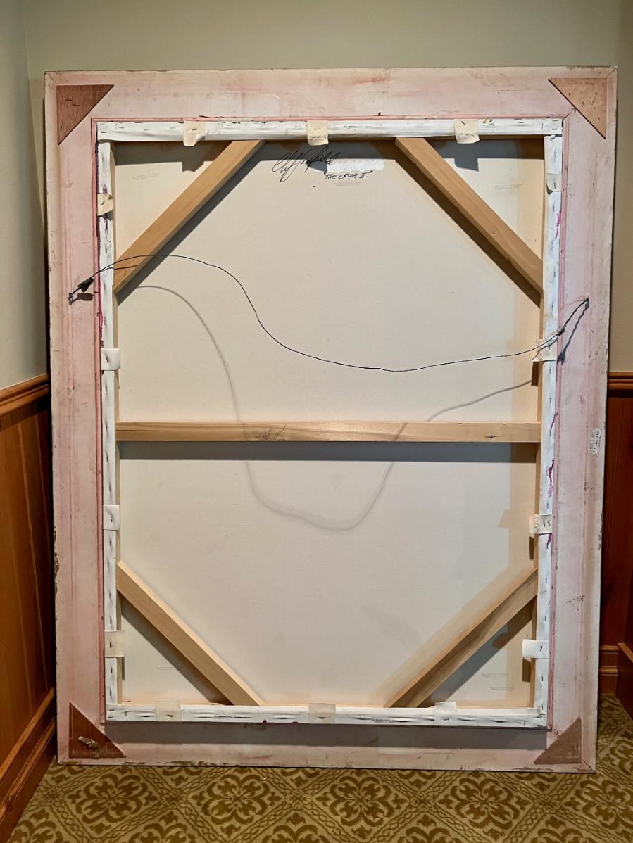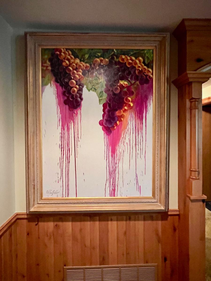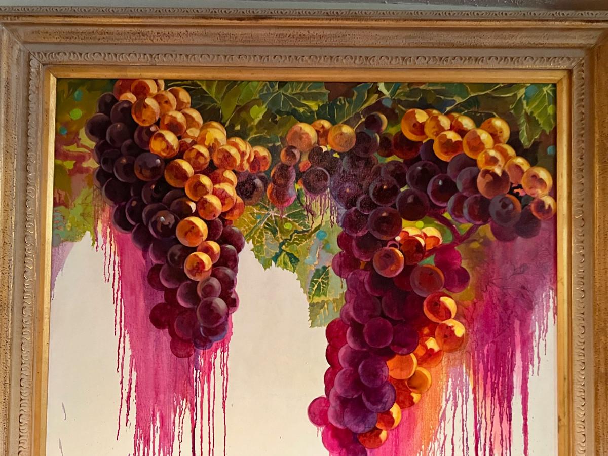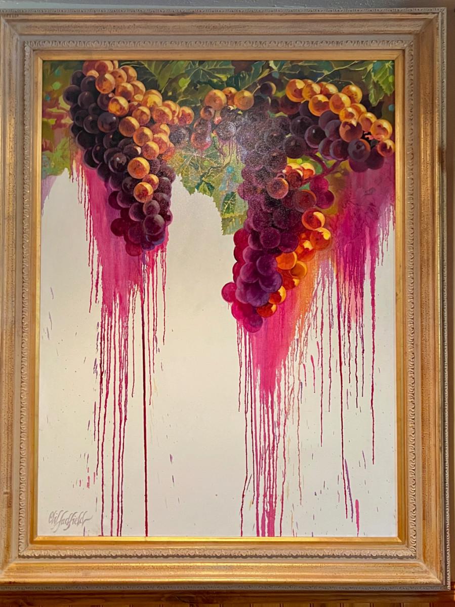 It's a rare thing to find a Clif Hadfield painting come up for sale. His work is widely reproduced in print, but an opportunity to acquire an original work - a true rareity. The original purchase price - $14K. "The Crush II" is from a series of Wine and Winery inspired subject matter which is prevalent throughout his body of work. MEDIUM: Acrylic on stretched canvas, nicely framed in heavy gilt wood. SIZE: (this painting is BIG) Image: 36x48", Frame: 48x57". SIGNED: Lower left and verso.