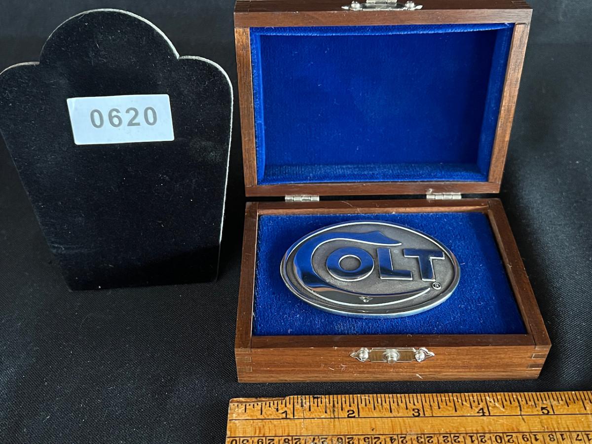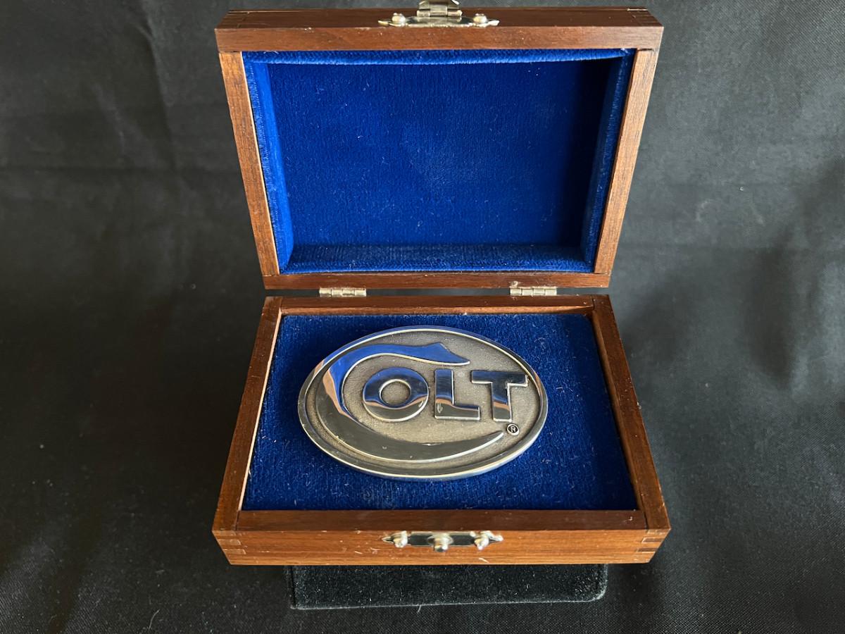 Rare Colt Solid Silver .999 Belt Buckle - THIS IS FIRST - #1 in the edition of 1000!! Secured snugly in velvet and walnut presentation box with a Rampant Colt emblem on the lid. A very nice piece of Colt memorabilia