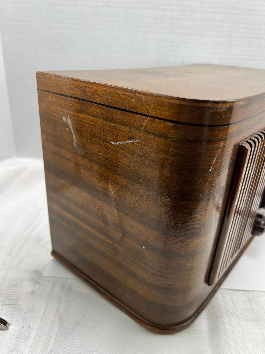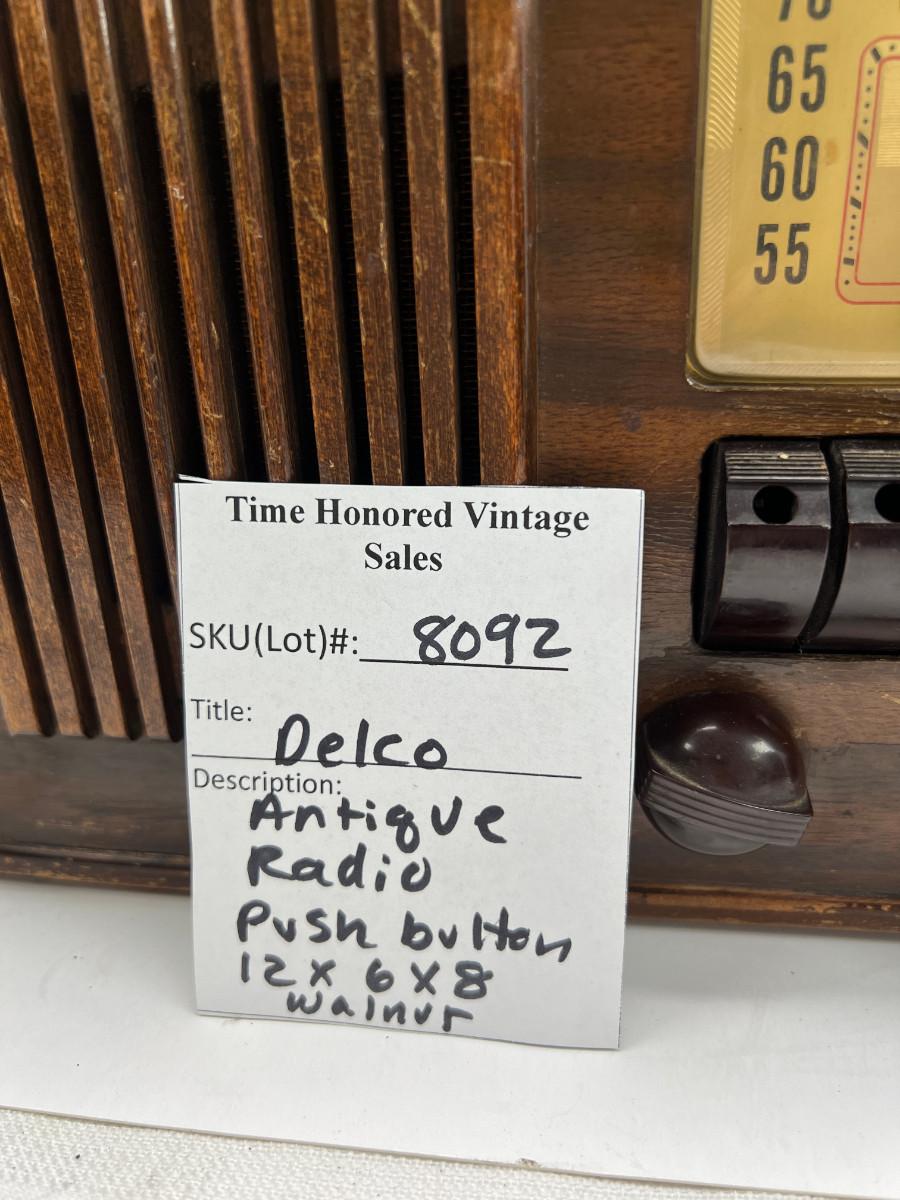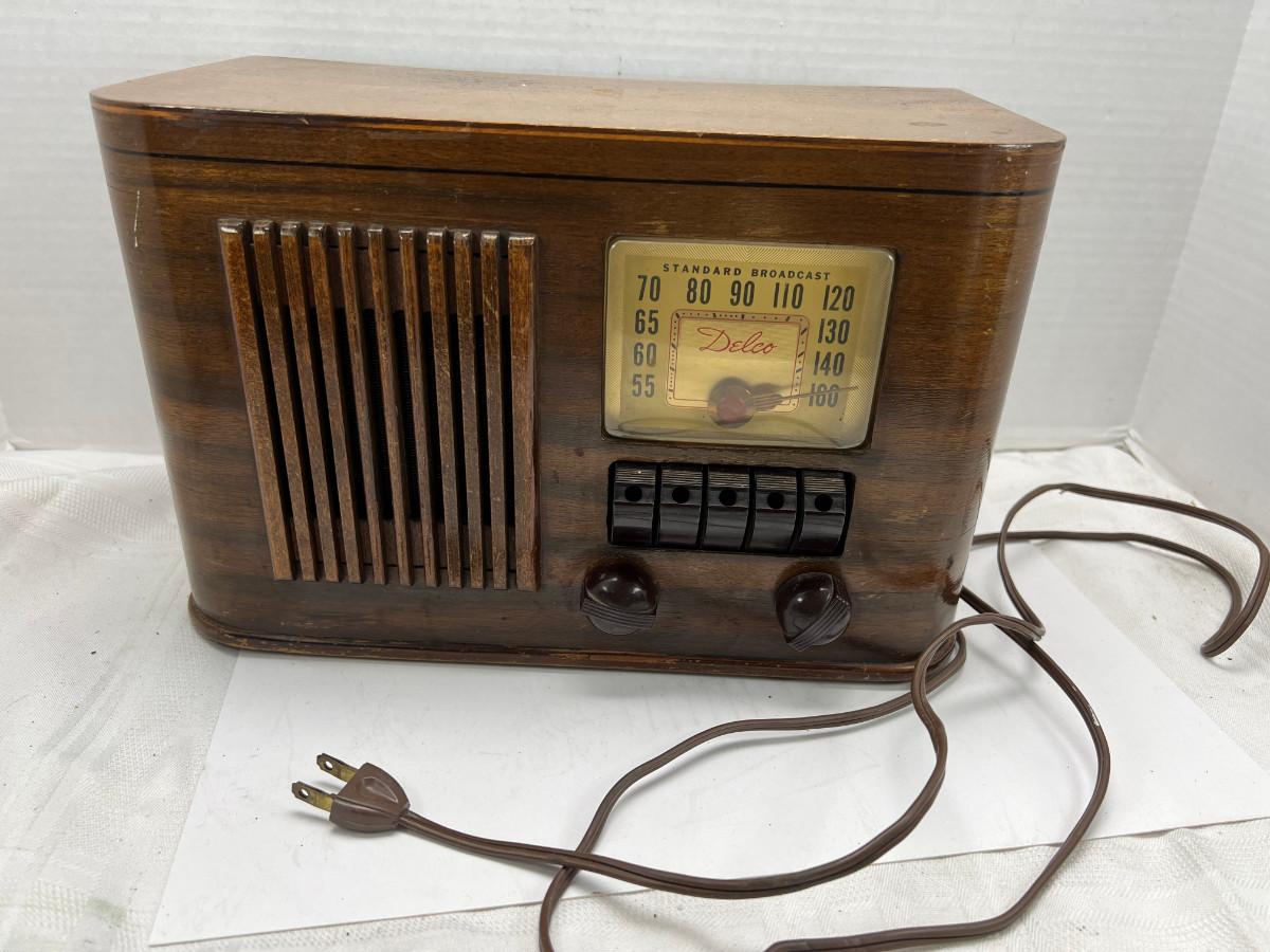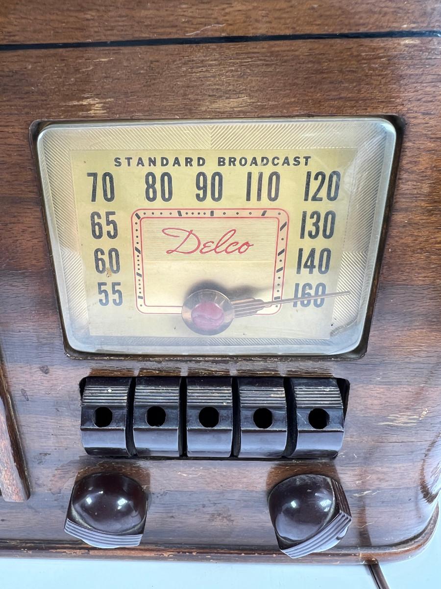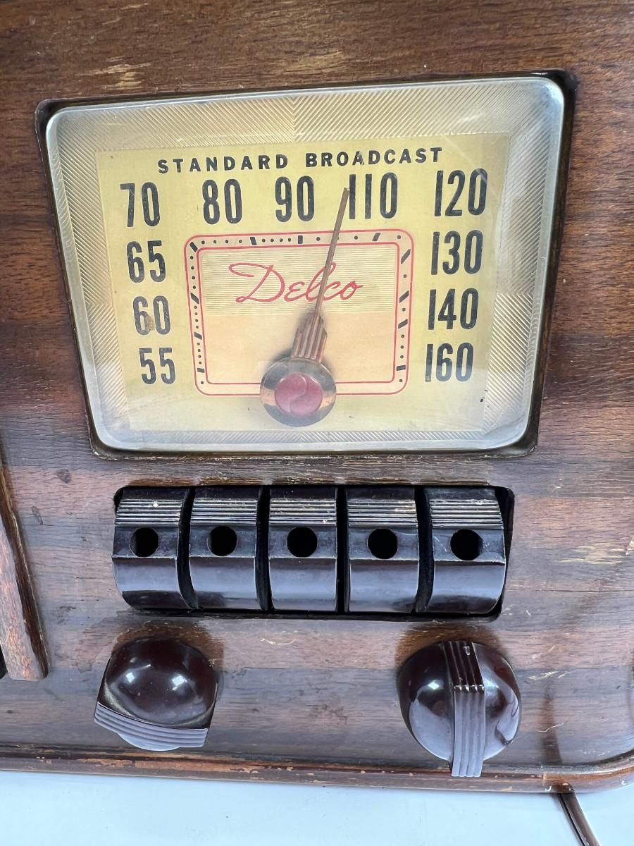 Wooden tabletop transistor radio with Bakelite knobs and buttons, all still move, and the tubes are intact. Beautiful Pre-WWII Vintage Tube Radio, this 1939 Delco Model has six (6) tube AM radio with 5 Push Button Presets. This radio was designed for reception of standard broadcast (AM) and Aircraft/Police using the internal antenna, although the Aircraft and Police Band is obsolete.Unit is being sold as a "non-working" vintage electronic device that should be gone over by a qualified technician prior to use. May have rust, corrosion or other flaws see pictures.