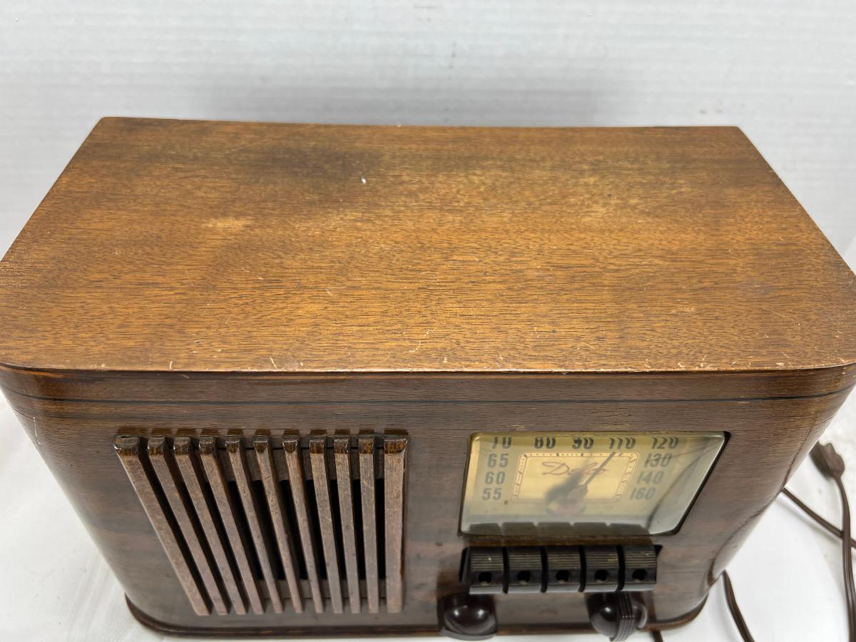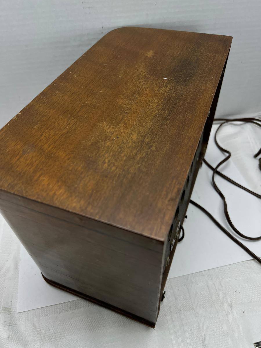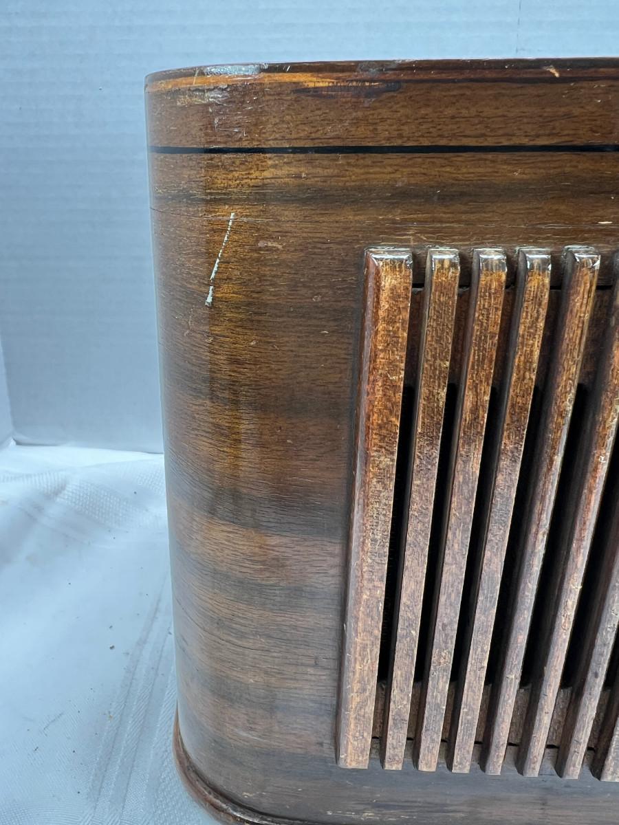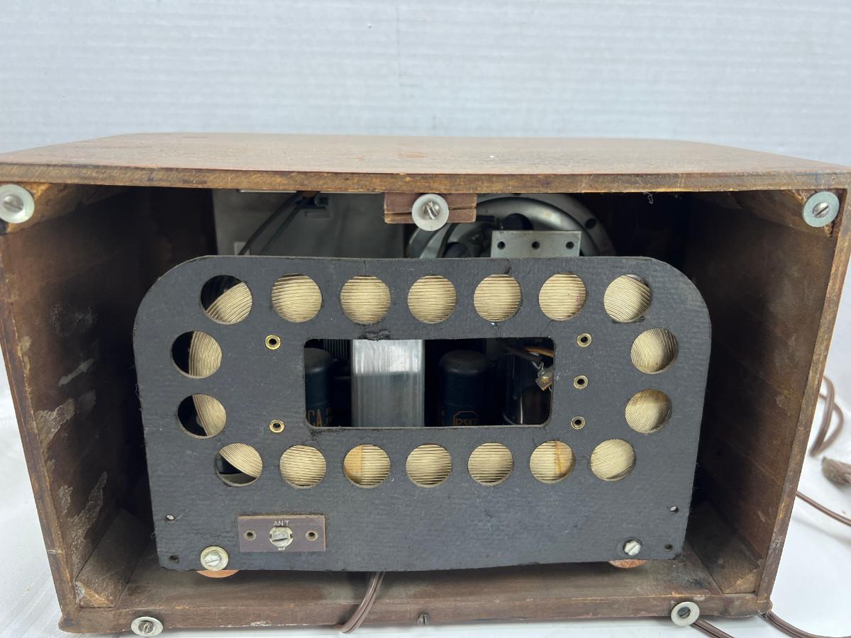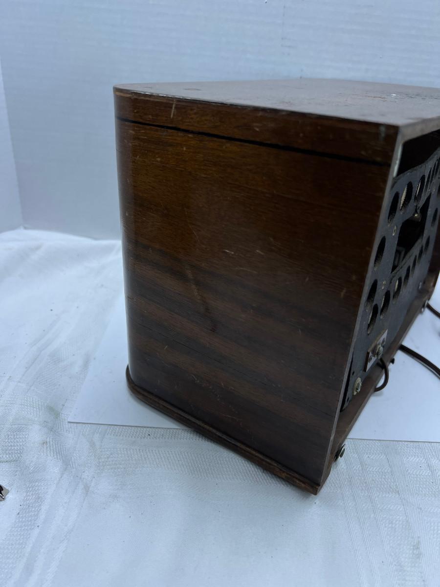 Wooden tabletop transistor radio with Bakelite knobs and buttons, all still move, and the tubes are intact. Beautiful Pre-WWII Vintage Tube Radio, this 1939 Delco Model has six (6) tube AM radio with 5 Push Button Presets. This radio was designed for reception of standard broadcast (AM) and Aircraft/Police using the internal antenna, although the Aircraft and Police Band is obsolete.Unit is being sold as a "non-working" vintage electronic device that should be gone over by a qualified technician prior to use. May have rust, corrosion or other flaws see pictures.