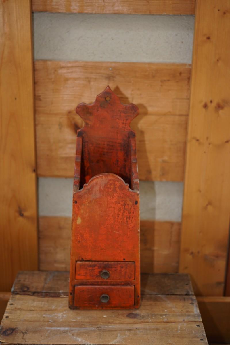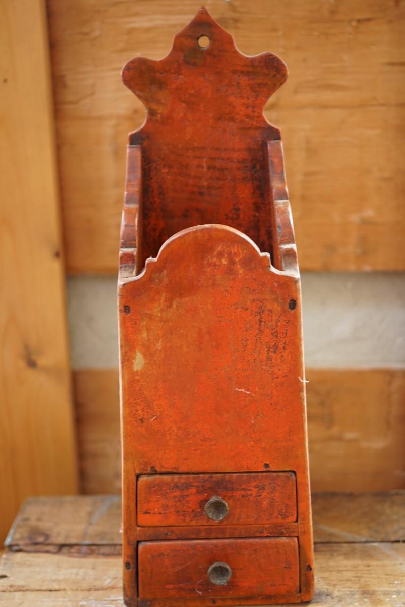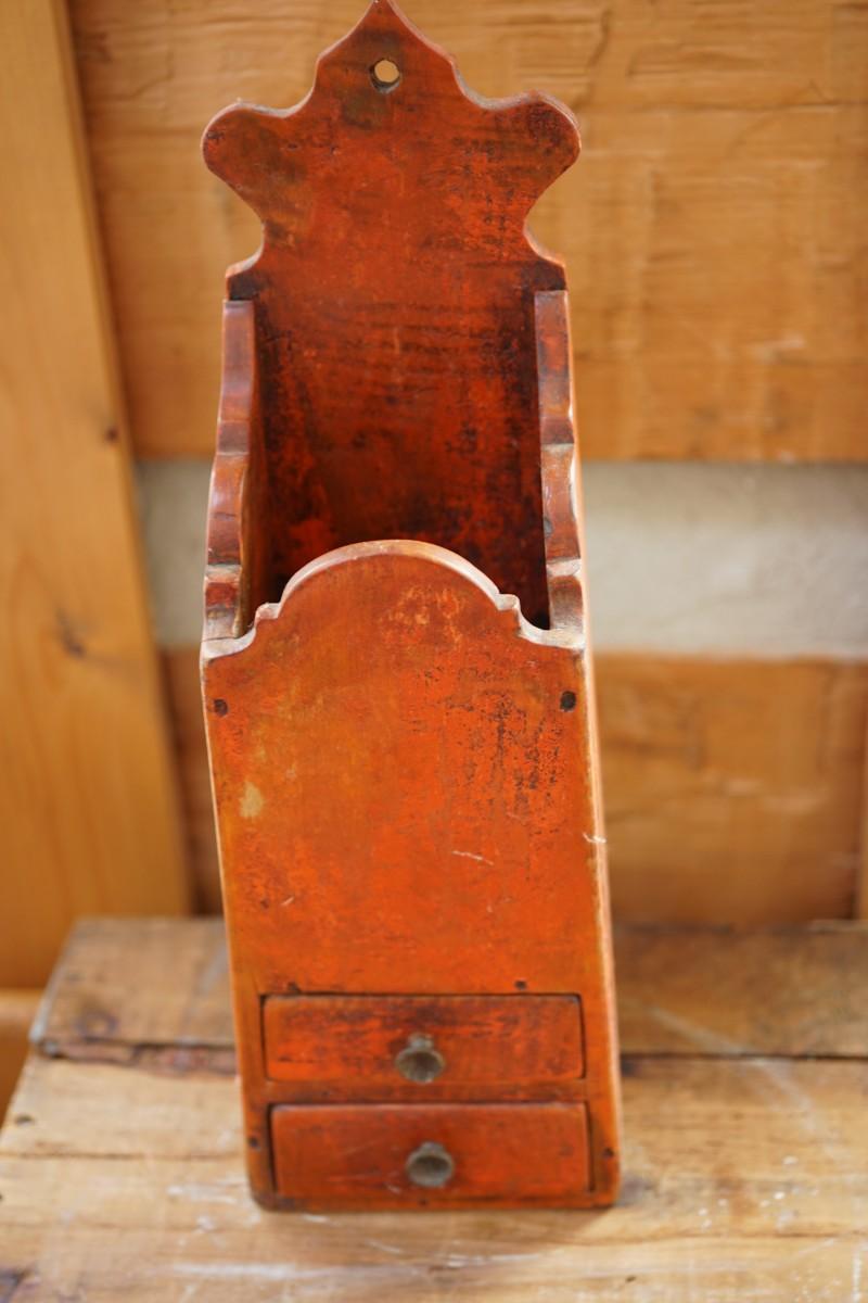 What a gem! An early hanging candlebox with two drawers with metal pulls, The paint is a red tone orange. Very rustic and it is the original paint. the construction has hand forged nails. This piece was done by a very talented craftsman. Nice scroll work.