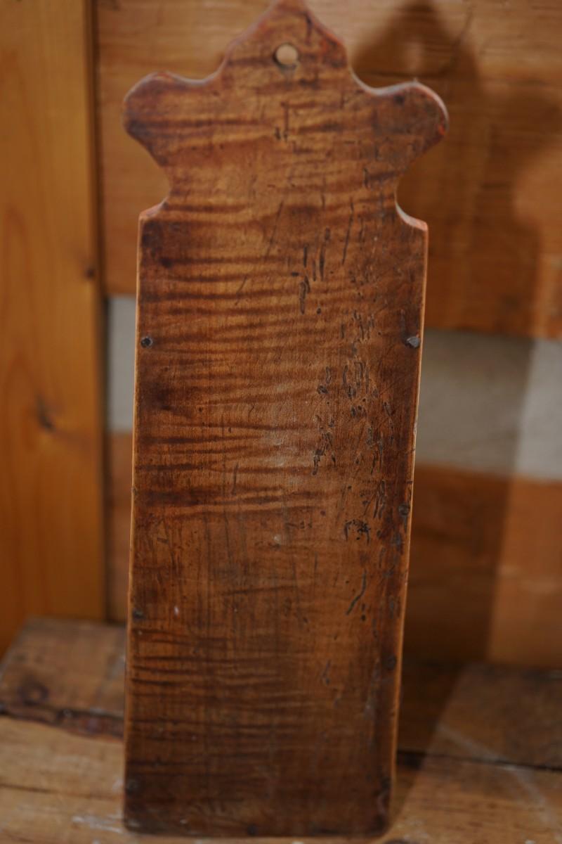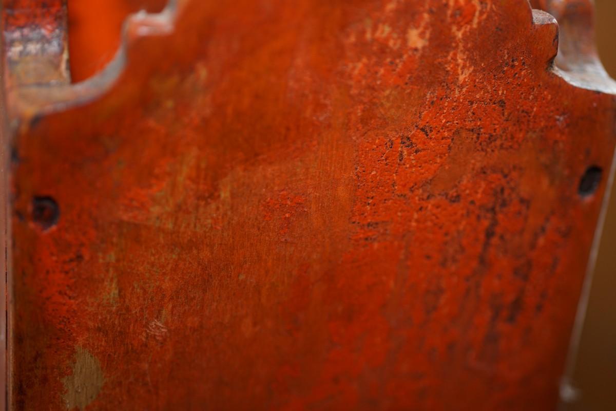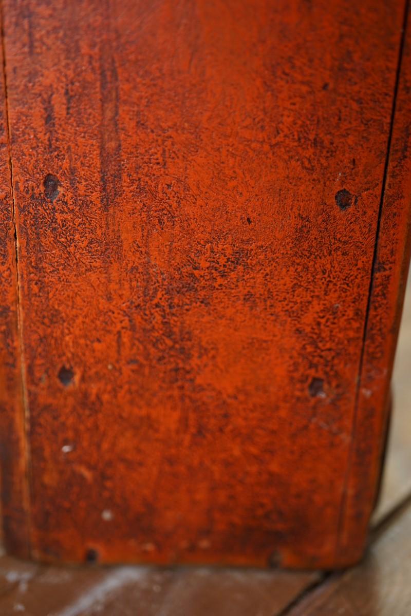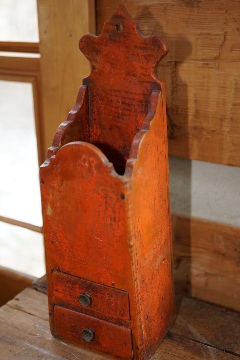 What a gem! An early hanging candlebox with two drawers with metal pulls, The paint is a red tone orange. Very rustic and it is the original paint. the construction has hand forged nails. This piece was done by a very talented craftsman. Nice scroll work.