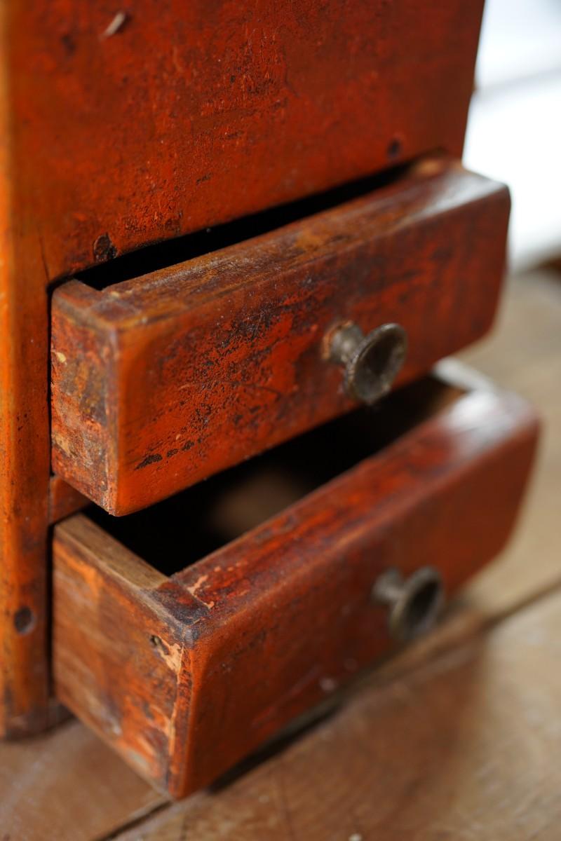 RARE EARLY 18TH - 19TH CENTURY WALL HANGING CANDLE BOX W/ ORIGINAL ORANGE PAINT / TWO DRAWERS HAND MADE
