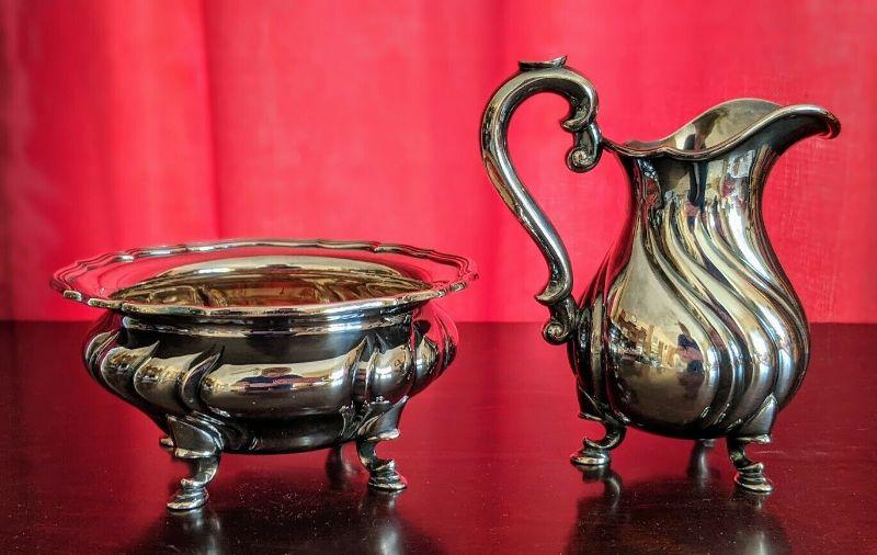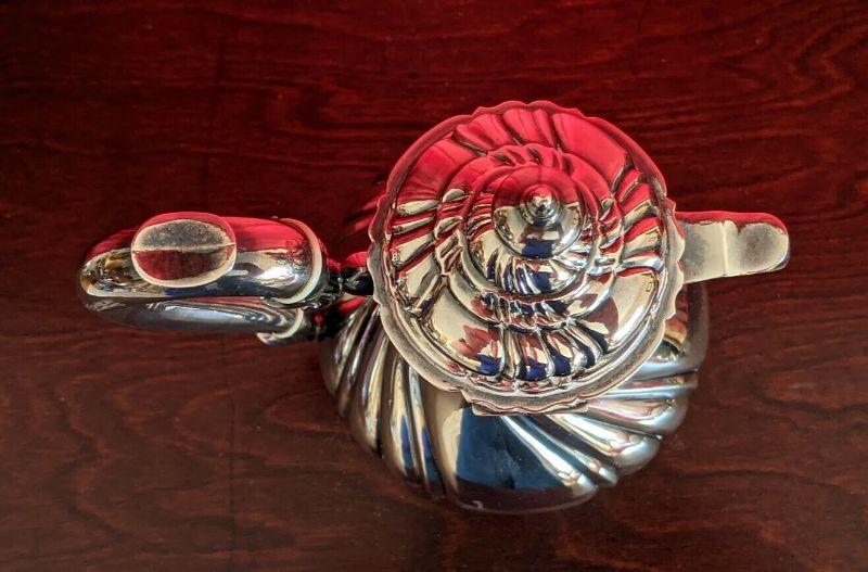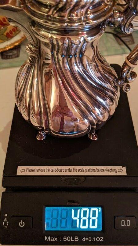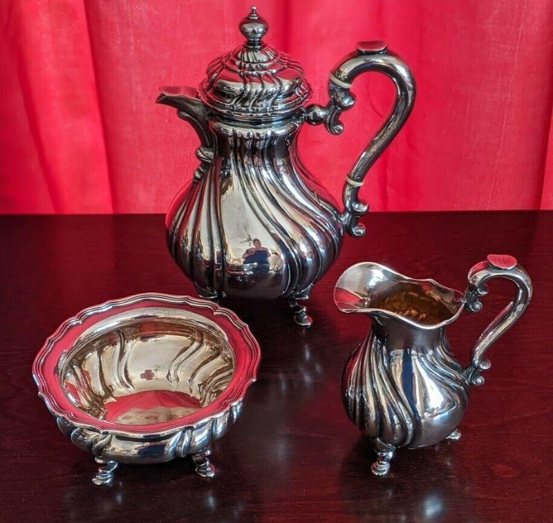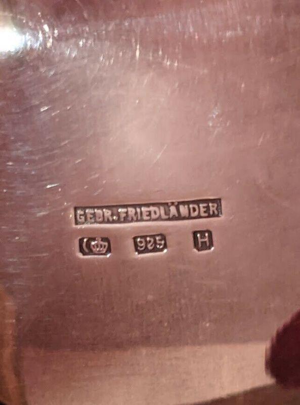 Rare Emil Harnisch maker, Gebr. Friedlander retailer Sterling Silver Teapot, Creamer, Sugar