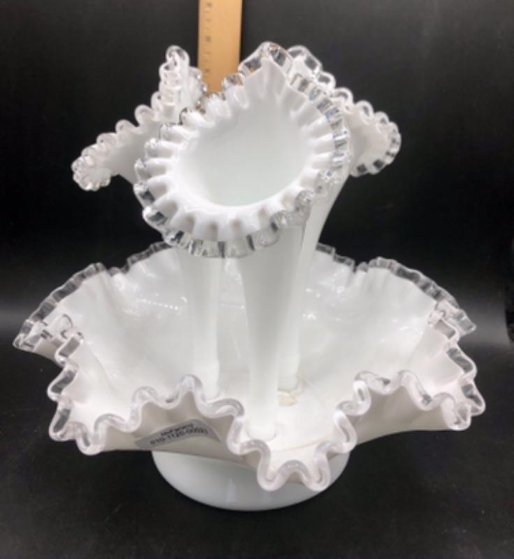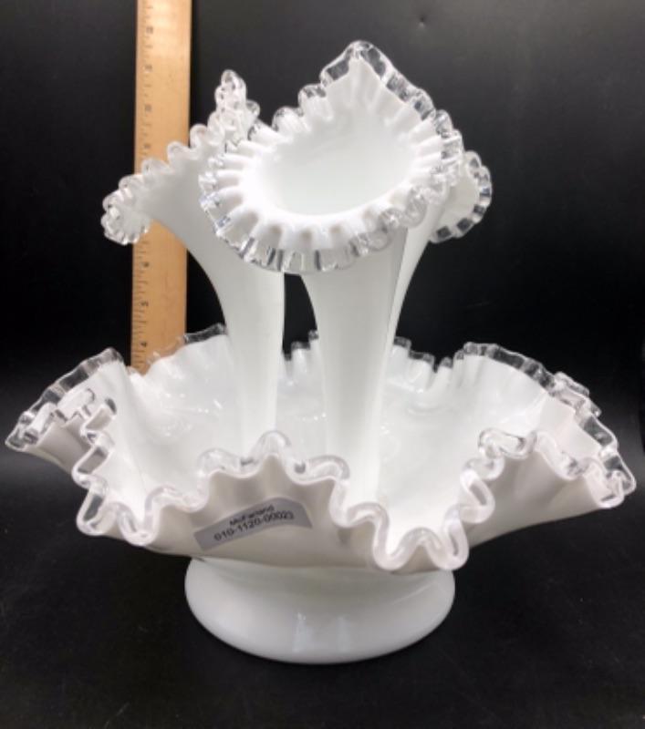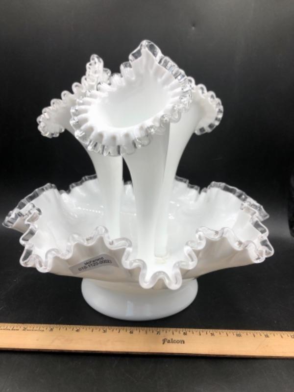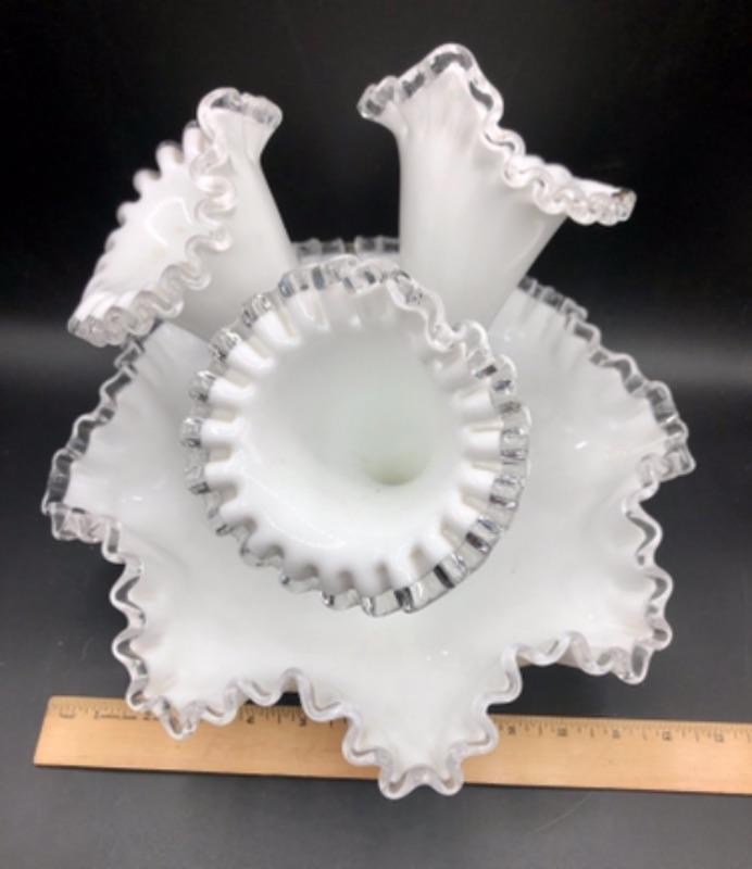 Beautiful and rare Fenton Flower Epergne. White ruffle with a clear “silver crest” edge. Three removable flower flutes. There is a fine crack that has stained inside the bottom along the opening where a flute sits. Does not affect how the flute sits in the base and would be unnoticeable depending on how/where it is displayed. Stands about 11” and is about 12” wide.