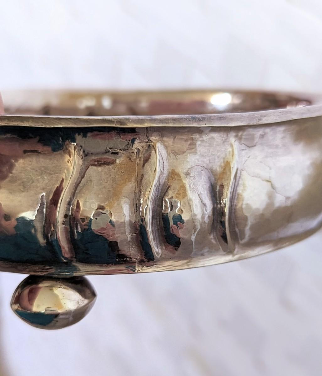 Sides of the bowl feature the silversmith's hammer marks as part of the design. the base of the bowl has some small dings. The rim has a few very minor dings that frankly, are hard to differentiate from the hammer work. Base shows the makers name and mark, German moon and crown 900 hallmarks.