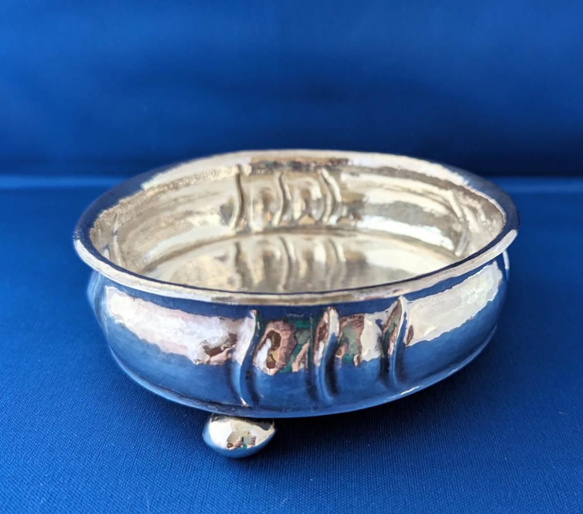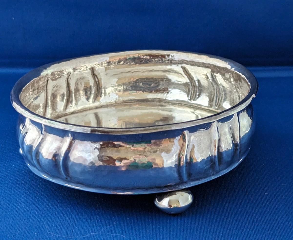 Rare find! Hand made 900 silver bowl by Karl Schibensky. Hammered silver bowl with three pad ball feet. Decorated with a series of 3 wavy lines at 4 intervals around the bowl.