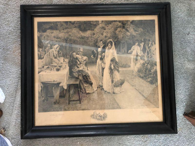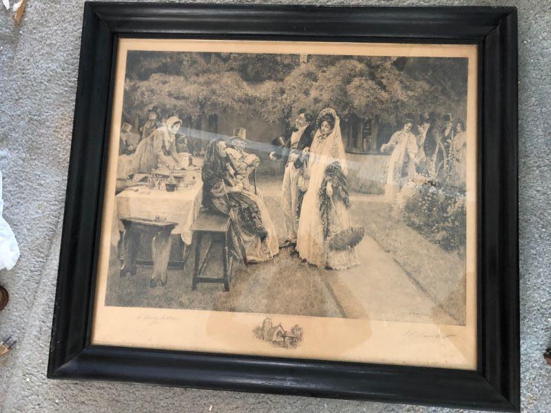 Rare W. Dendy Sadler "Wedding Brunch" Engraving Print. Double signature. One from the artist and the signature of W.H. Boucher. Framed piece has some discoloration due to age. Backing is loose, letting glass slip if not careful. About 24x20.