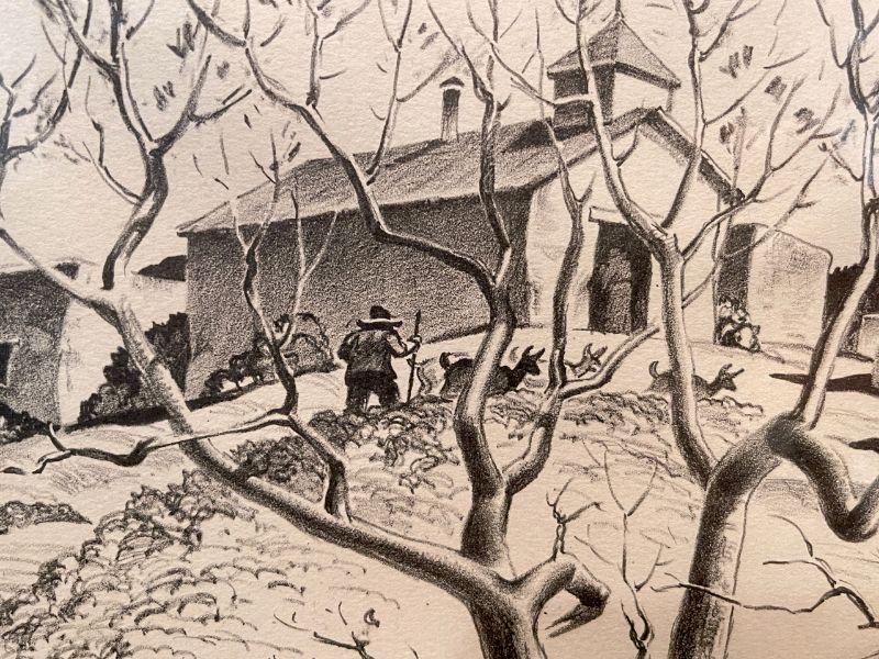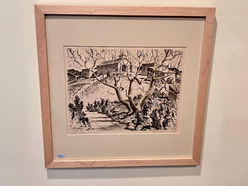 This is an original signed lithograph print by founding Prairie Printmaker member Coy Seward. The New Mexican landscape features a small short-steepled church and some road-side dwellings with an older gentleman herding goats up the road.