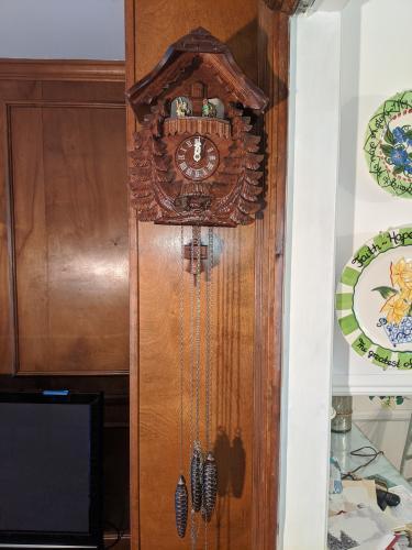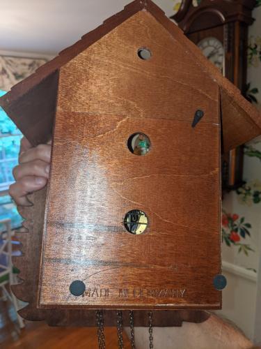 RARE Goebel Hummel Dancing Figurines Musical Cuckoo Clock. Regula German Black Forest animated Swiss musical chalet Cuckoo Clock with dancing Hummel Goebel figurines. Deeply carved with a classic chalet design and wonderful detail. But what really makes this cuckoo clock stand out is the rare and adorable Hummel characters ! (see pics). Each figurine is stamped M.J. Hummel Goebel. The maker on this stunning Cuckoo Clock is Regula and is stamped 25 / 1-P. (not sure but assuming that this is the model and or the mechanism number.) Other numbers found on the brass mechanism are stamped G.M. 186 this may be the patent numbers for the mechanism. Also stamped, Made in Germany. Clock face, hands, pendulum, pine cone weights and figurines are in very good condition. The only minor cosmetic issue on this clock is down at the base. The small birds have chipped/broken and repaired wing tips. These are very small birds so you really don't notice it unless you get up very close