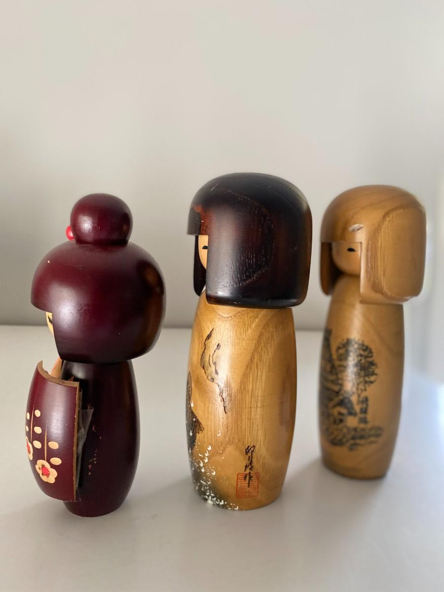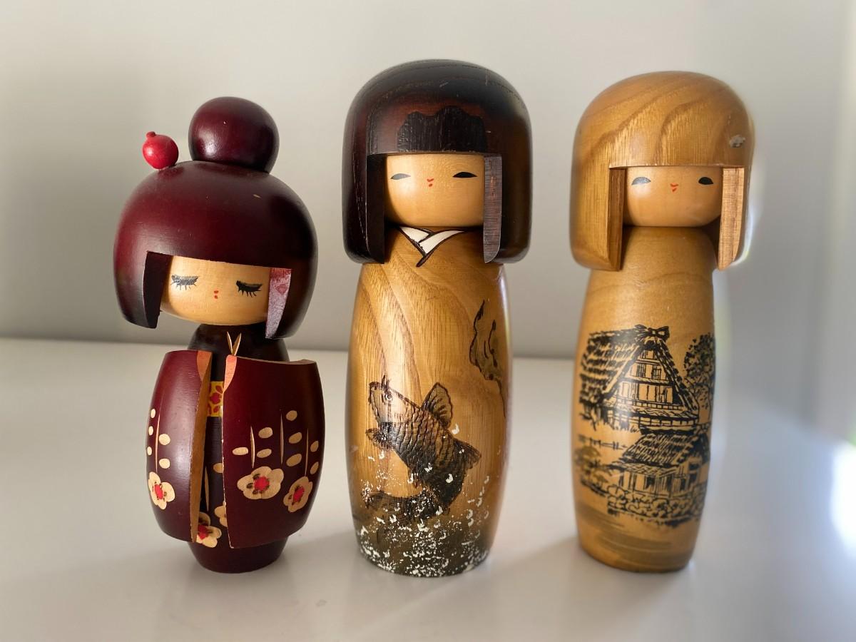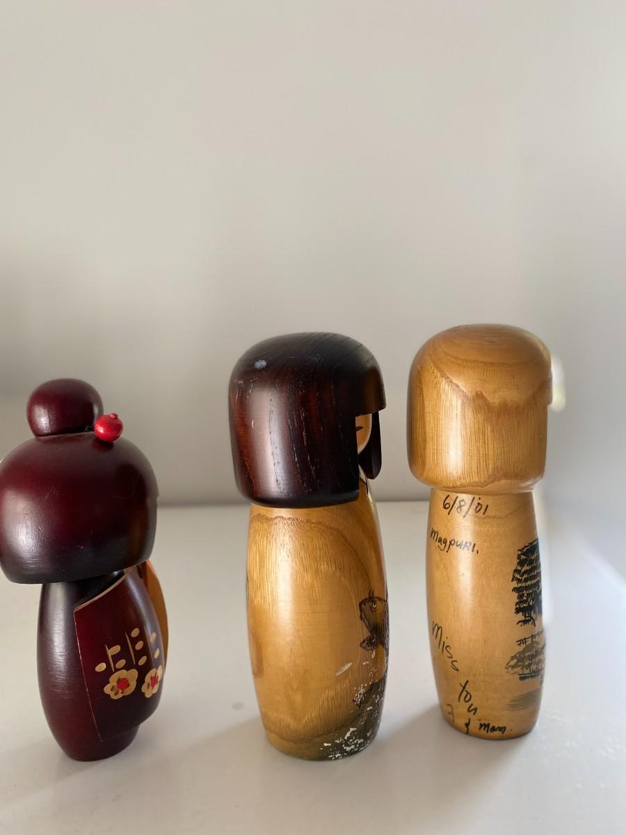 3 hand crafted/painted dolls. One has slight damage to front while another has some writing on it. Please see photo for details.