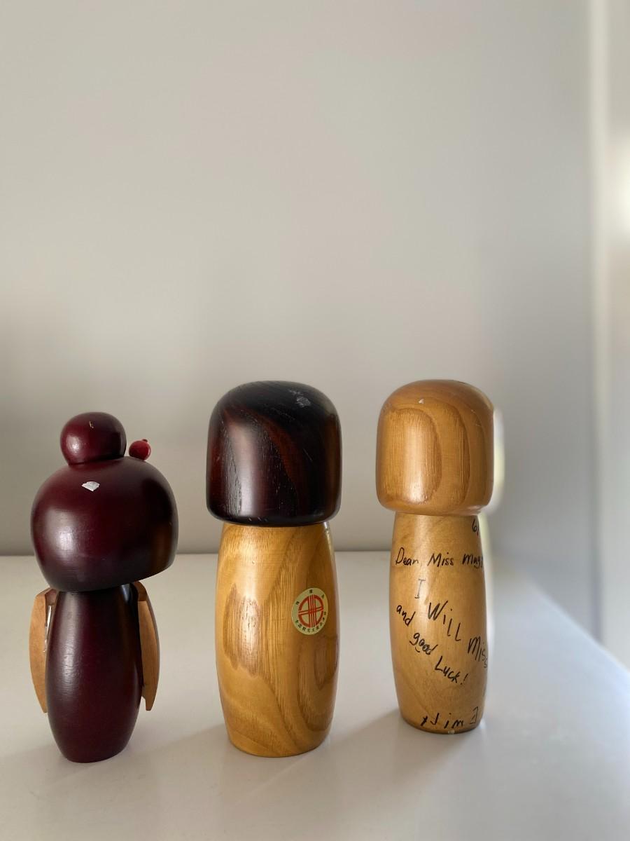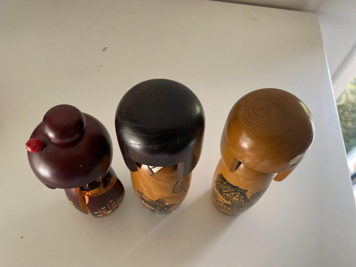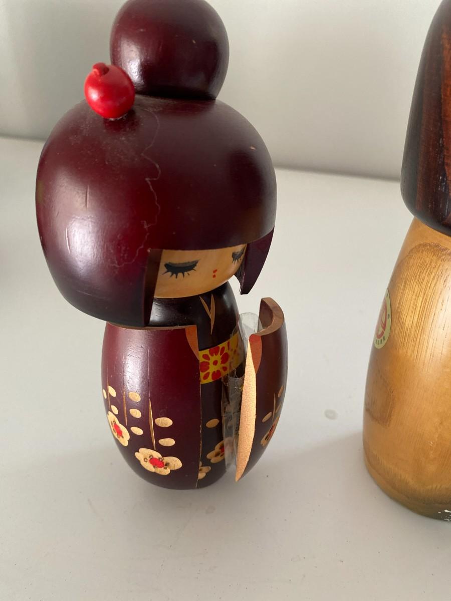 3 hand crafted/painted dolls. One has slight damage to front while another has some writing on it. Please see photo for details.
