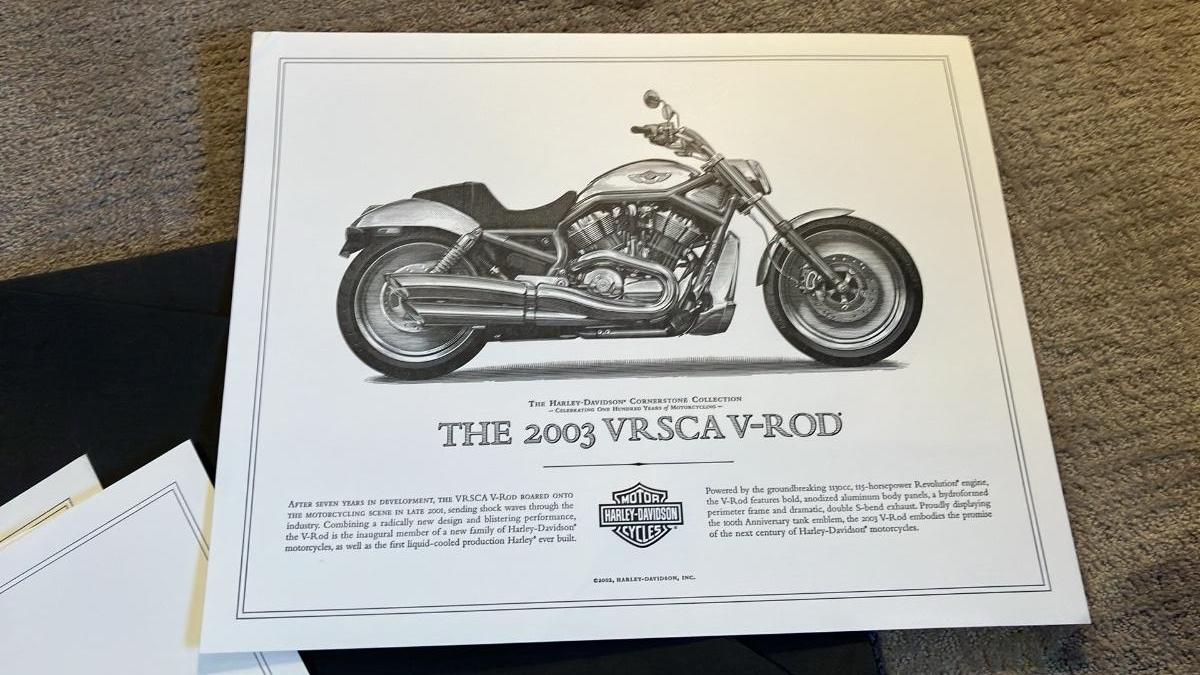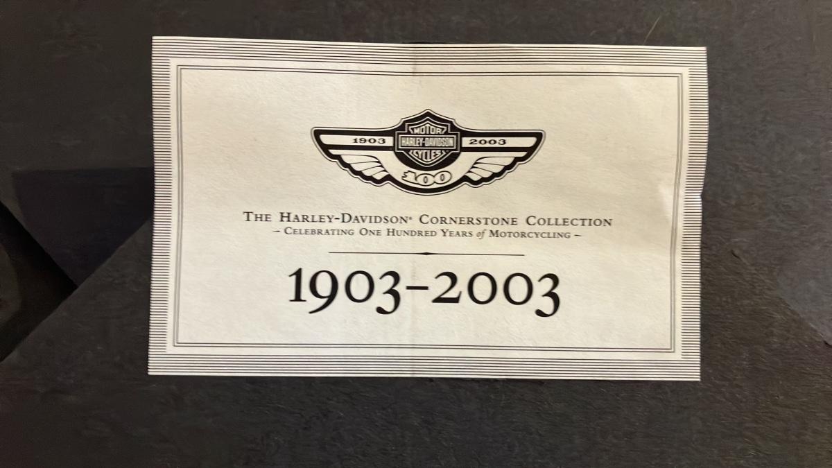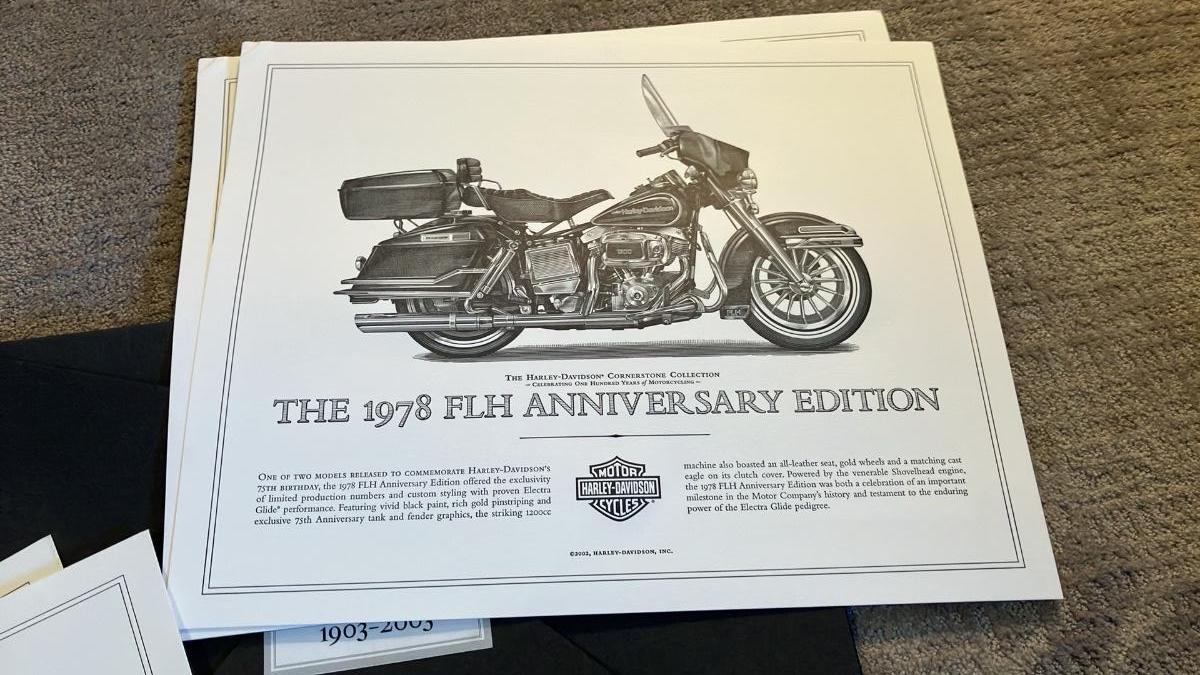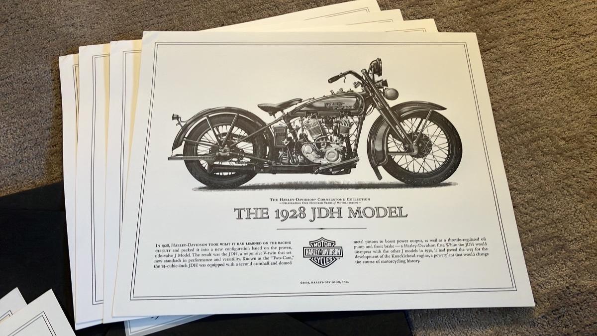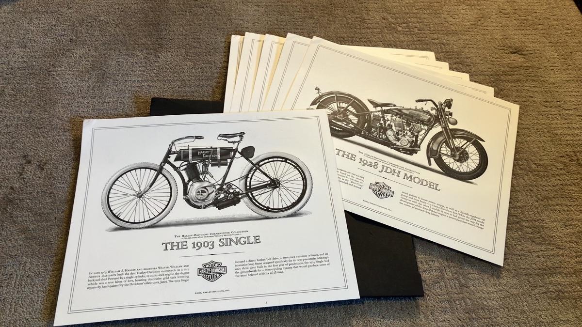 Rev up your collection with this exceptional 100th Anniversary Harley-Davidson Collectible Print Set, commemorating a century of legendary American engineering from 1903 to 2003. This rare portfolio includes five oversized 16"x20" art prints, each showcasing iconic Harley models in stunning black-and-white line art with elegant gold accents and authentic historical detailing—ideal for framing, man cave displays, or garage decor.