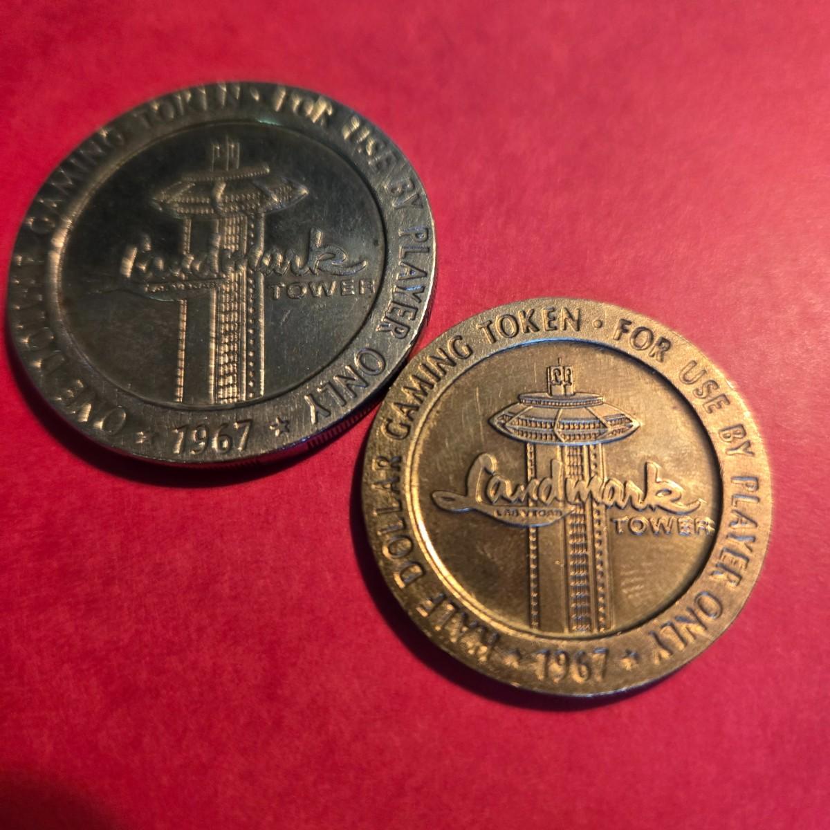 This lot is for Rare Historic Landmark Tower Casino Game Tokens. These are a pair of Landmark Casino Gaming tokens. The larger one measures about 1.5-inches diameter and is a $1 token, the smaller is the RARE half dollar token which measures about 1.25-inches in diameter. They are both in used condition. The Landmark was operating from 1969-1990.