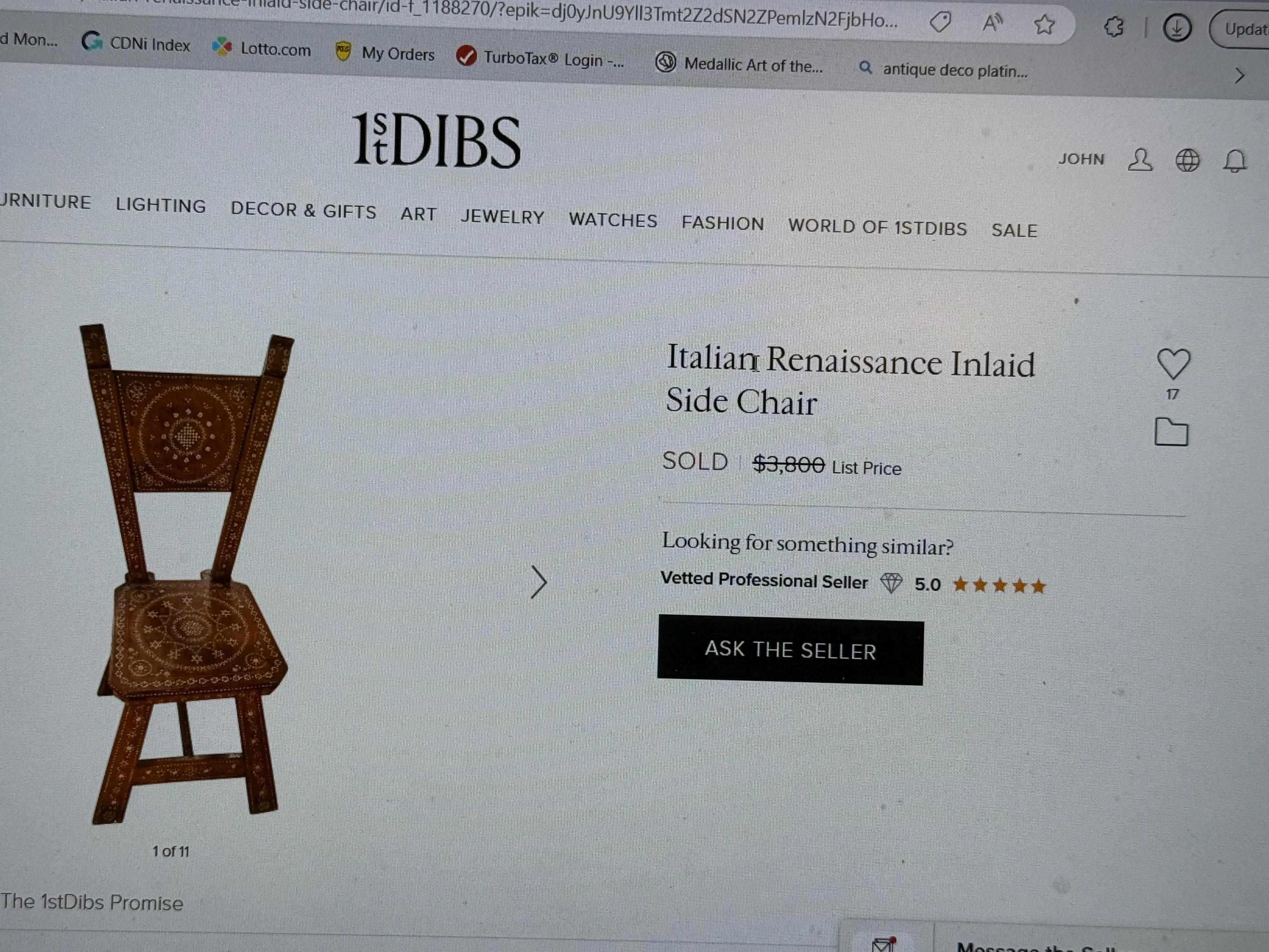 Rare Italian Renaissance Inlaid Side Chair c1600's in VG Preowned Condition as Pictured. (PICKUP ONLY). Rare 16th Century Italian Walnut Side Chair with intricate Bone Inlay. Decorated throughout 'a La Certosina'. Certosina is a decorative art technique used widely in the Italian Renaissance period. Similar to marquetry, it uses small pieces of wood, bone, metal, or mother-of-pearl to create inlaid geometric patterns on wood. The term comes from Certosa Church in Pavia, where the technique was used in ornamenting an altarpiece. (PICKUP ONLY BY APPOINTMENT IN BRICK, NJ)