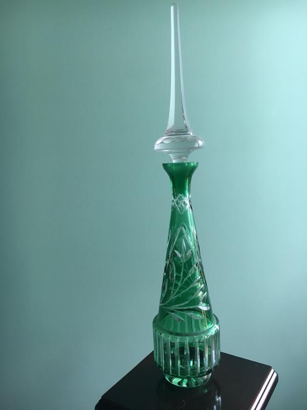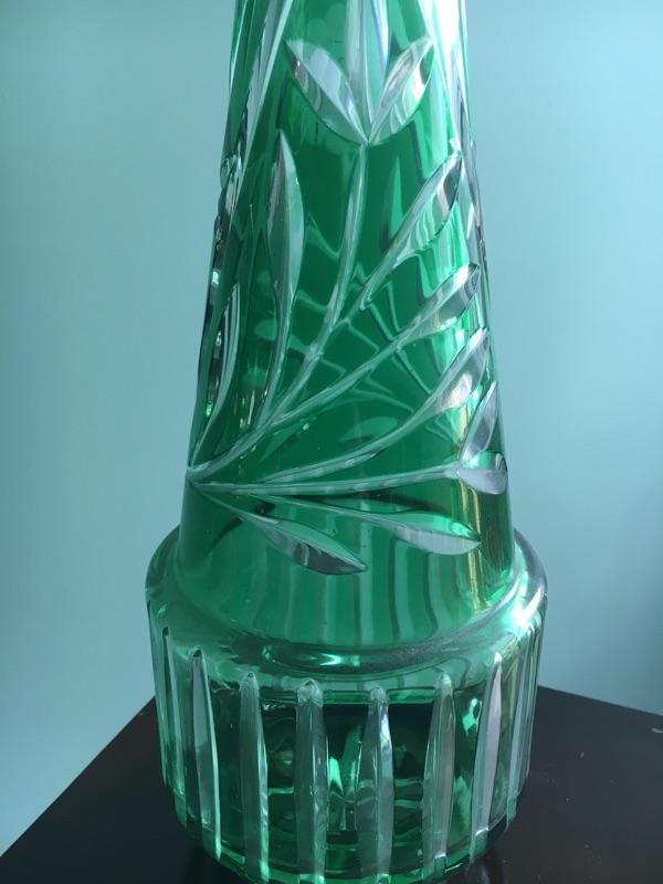 Cut Crystal Decanter/Vase - Large ~26”Hx5”W Green cut to clear - Likely 1960’s Belgian manufacturer artisan “Val.St.Lambert”