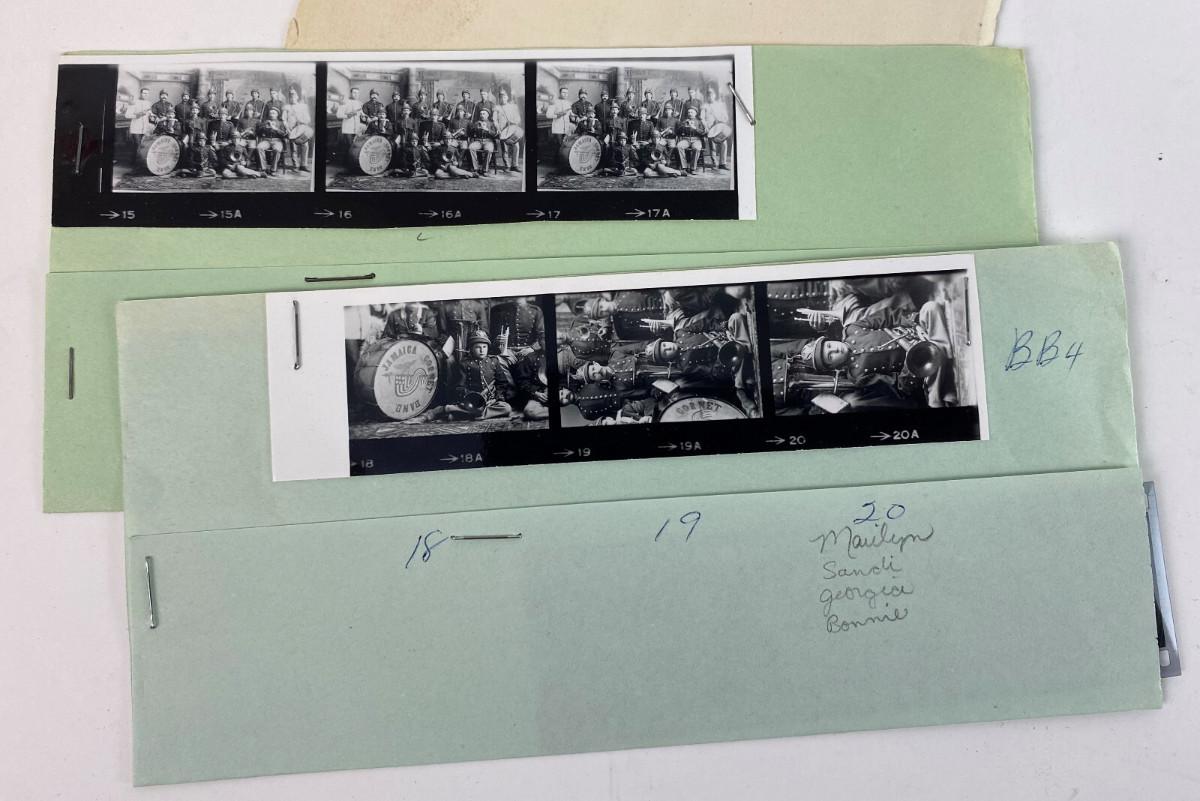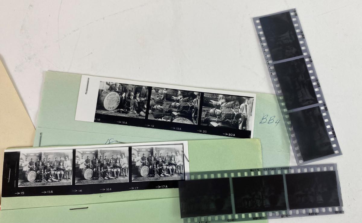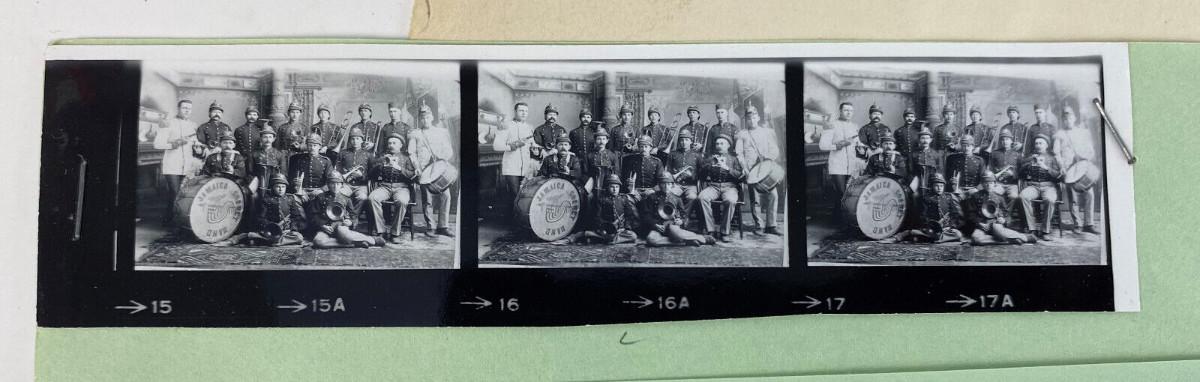 13.75 x 9.5" uncredited b/w photograph of the JAMAICA CORNET BAND of Jamaica, Iowa...Establshed in 1882...never a big town..its population high point was in 1910...at 379...In full regalia..Fifteen members with leader...This estate find includes proof strips and negatives of the photo from the “Golden Age of Bands”.